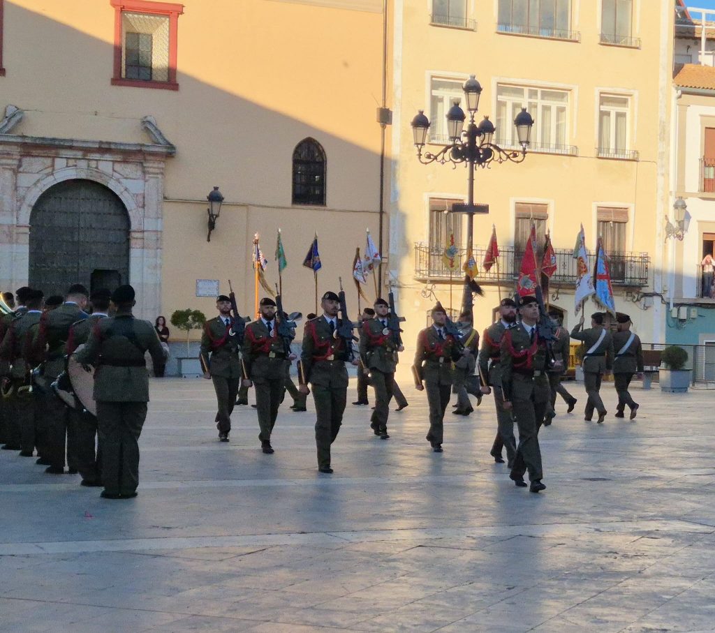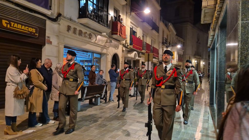 A las 20:00 horas, los militares de la Brigada de Infantería Mecanizada Guzmán el Bueno X aguardaban a las puertas de la Parroquia para escoltar a una de las imágenes más valiosas del barroco colonial americano, realizada en caña de maíz y profundamente venerada por la comunidad. A su lado, María Santísima del Socorro, advocación introducida en España por las huestes del Gran Capitán, completaba el solemne cortejo.