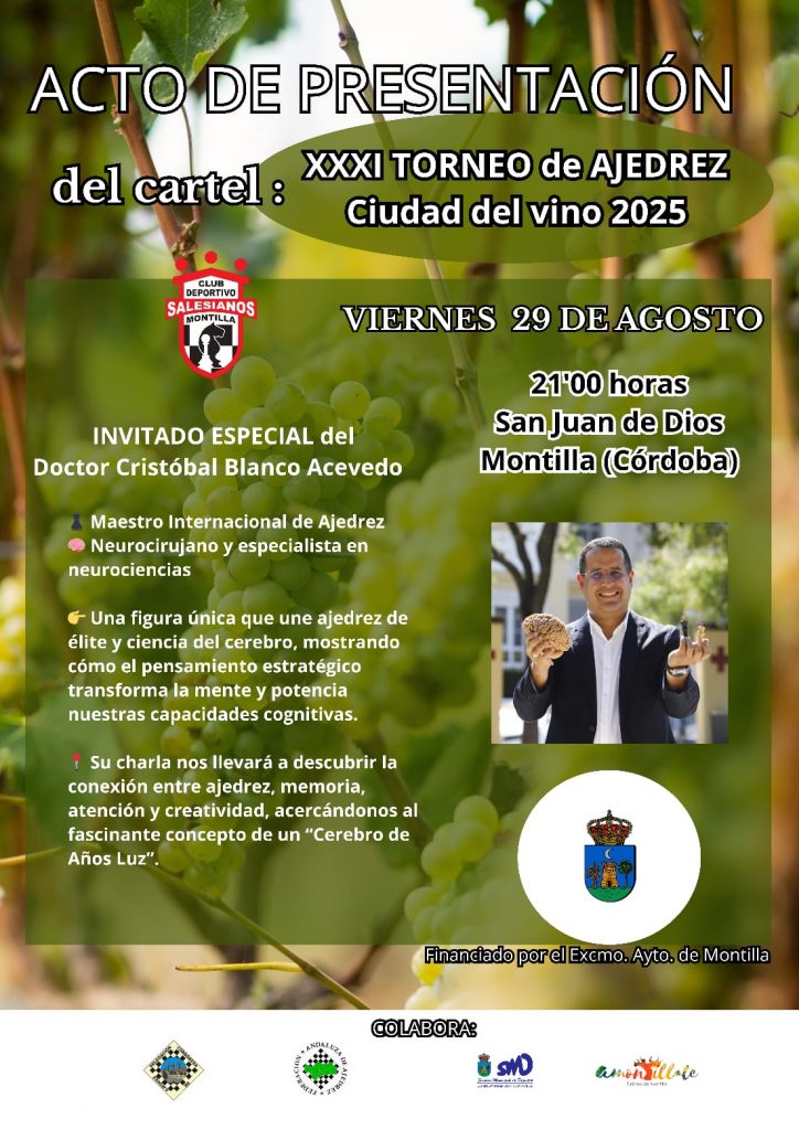 El Ayuntamiento de Montilla, en colaboración con el Club Deportivo “Salesianos Montilla”, la Diputación de Córdoba y la Delegación Cordobesa de Ajedrez, organiza la XXXI edición del Torneo de Ajedrez “Ciudad del Vino”, que se celebrará el próximo sábado 6 de septiembre de 2025, a partir de las 9:30 horas, en la sede de la Cooperativa La Unión (Avda. de Italia, 1).