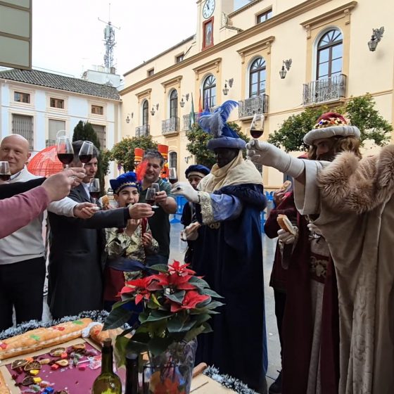 Sus Majestades los Reyes Magos, acompañados por el alcalde, el Hermano Mayor, el delegado de Festejos y miembros de la Hermandad de la