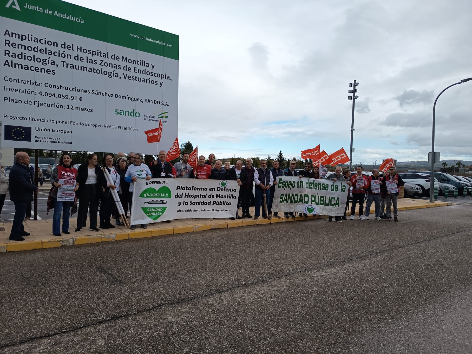 Delegados de CCOO se concentraron el pasado viernes a las puertas del Hospital de Montilla, coincidiendo con la visita de la delegada de Salud de la Junta en Córdoba al centro sanitario para conocer las nuevas instalaciones que, para el sindicato, no dan solución a las carencias sanitarias de la comarca por la falta de personal.