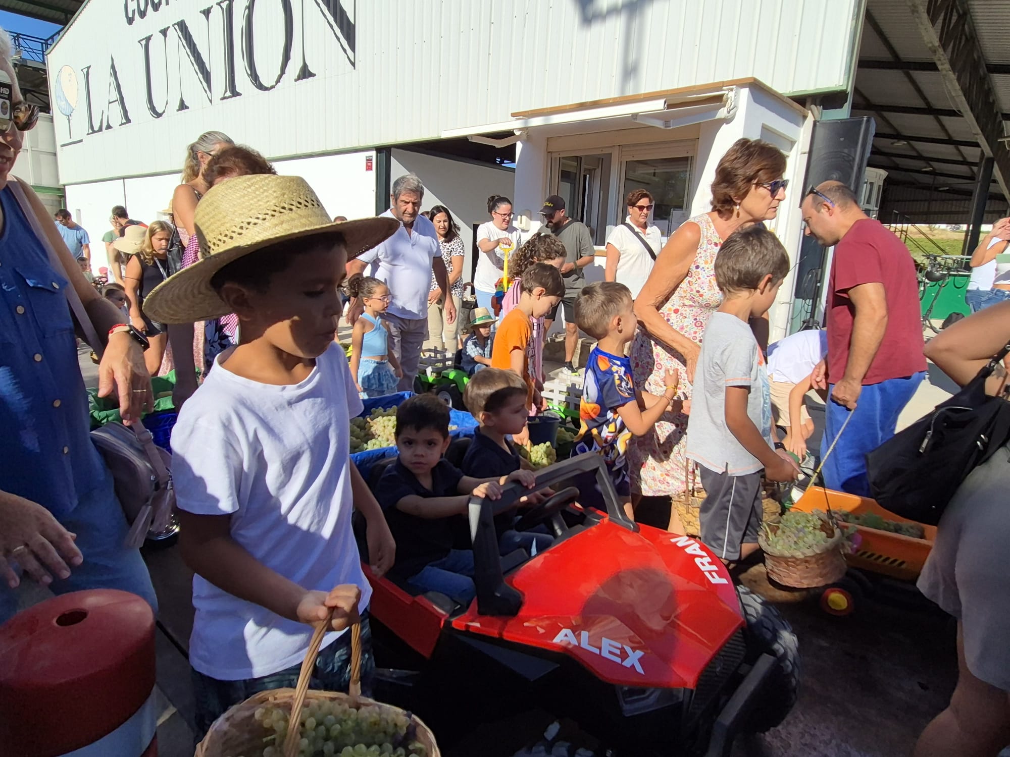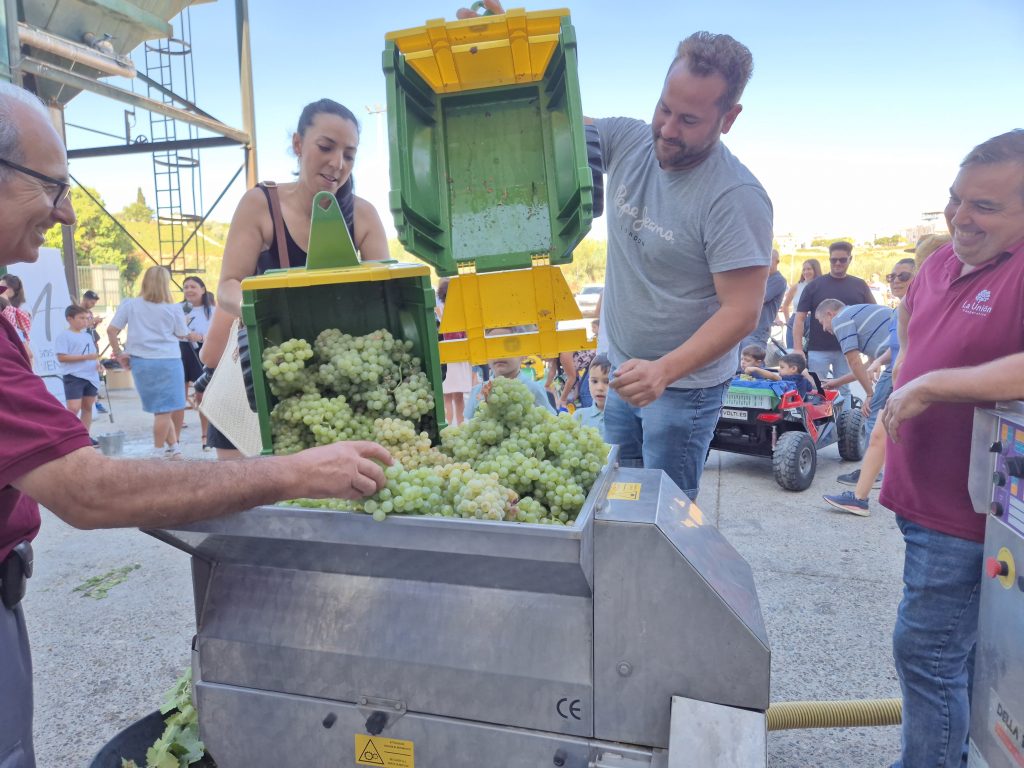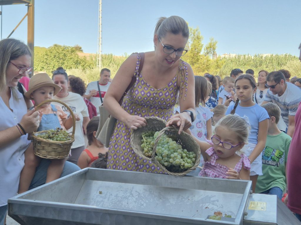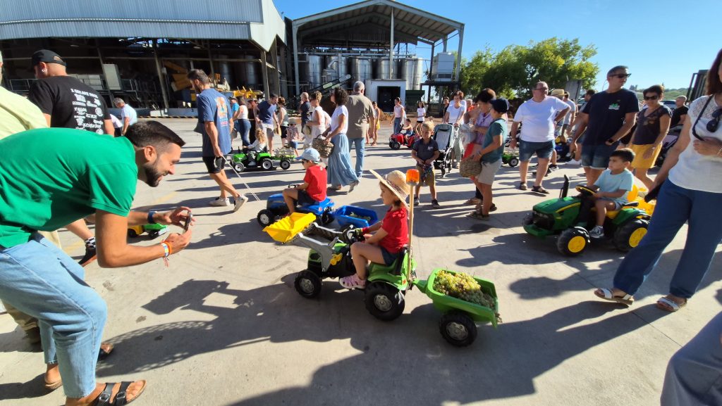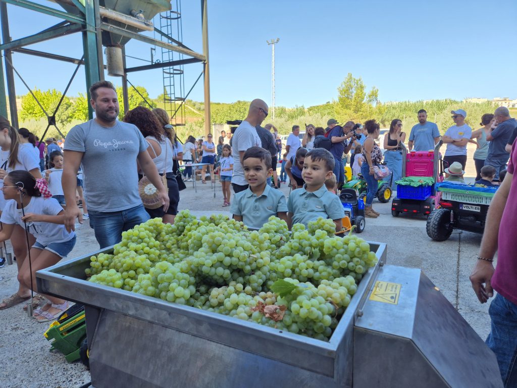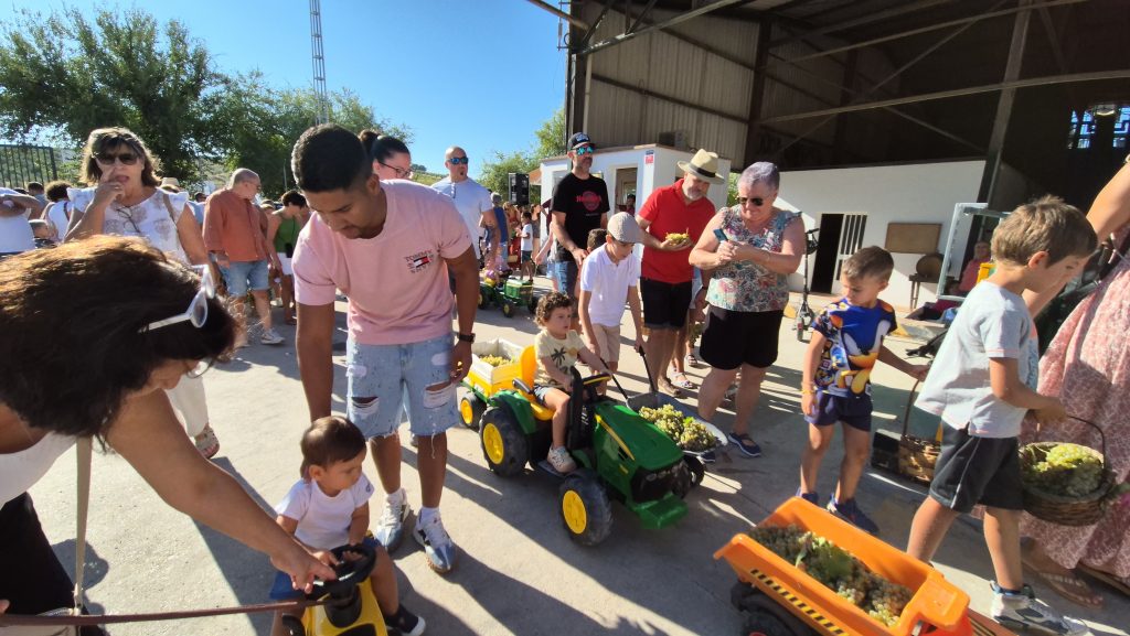 A las 10:00h llegaban los niños y niñas, llenos de ilusión junto a sus familias, portando las uvas en canastos, cestas y en pequeños tractores y vehículos tanto de pedal como de batería, cada vez más sofisticados. Durante la jornada, los participantes han tenido la oportunidad de experimentar todo el proceso que se sigue desde que se entra al lagar, la toma de grados, el peso en la gran báscula, para seguidamente pasar a una pequeña lagareta portátil instalada para este momento donde han depositado ellos mismos la uva, ha visto cómo se moltura y cómo se obtiene el mosto que también han podido catar para lo que han contado con las niñas y niños de la Asociación de la Venencia.