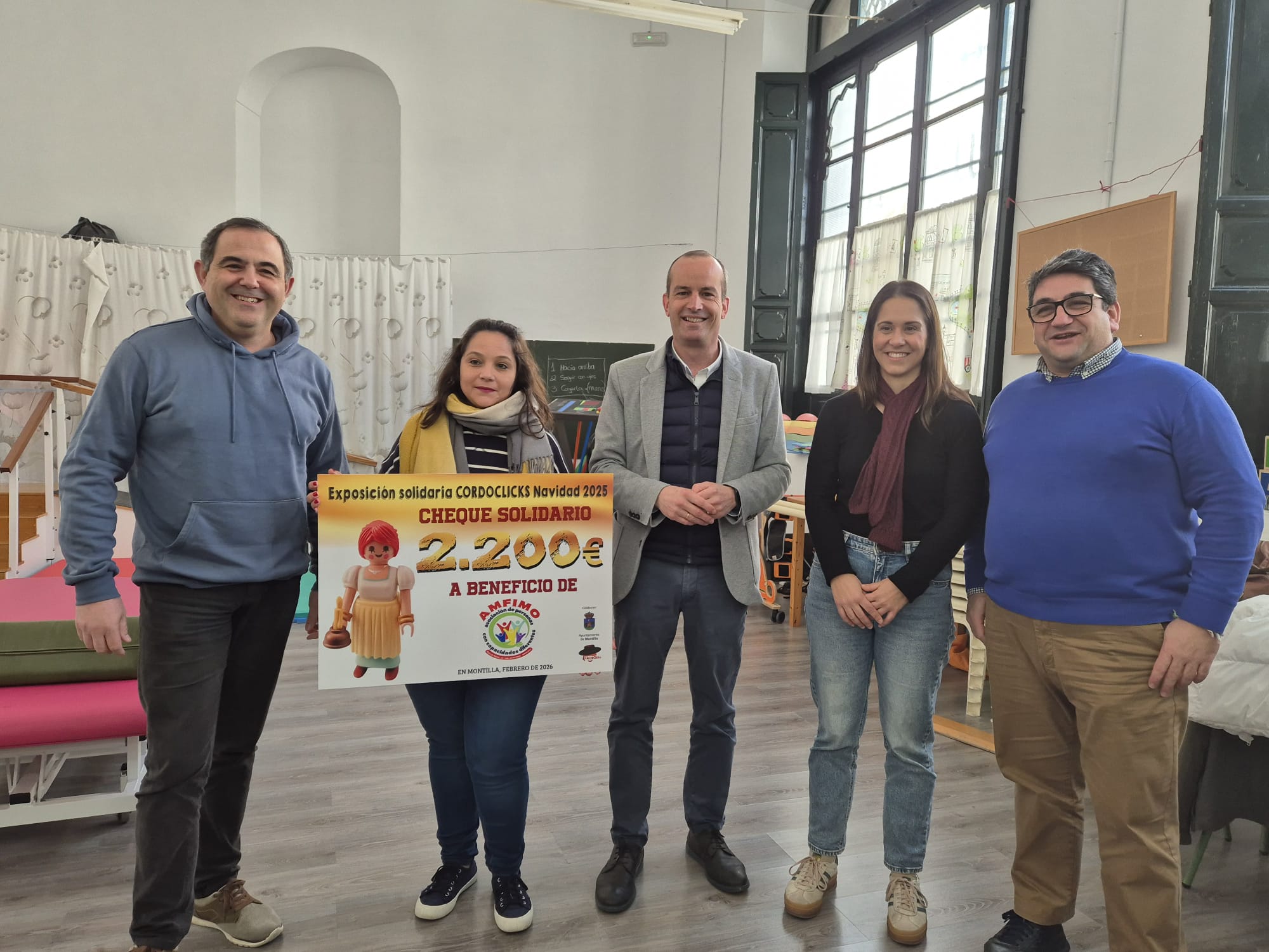 La sede de AMFIMO en el edificio de La Silera ha acogido la entrega del cheque solidario de 2.200 euros que la Asociación Cordoclicks ha destinado a esta entidad. La cantidad recaudada procede tanto de la Exposición de Dioramas de playmobil, como de la tradicional Ruta de Dioramas en edificios patrimoniales, ambas actividades celebradas durante el pasado mes de diciembre y enmarcadas dentro de la campaña de Navidad del Ayuntamiento de Montilla.