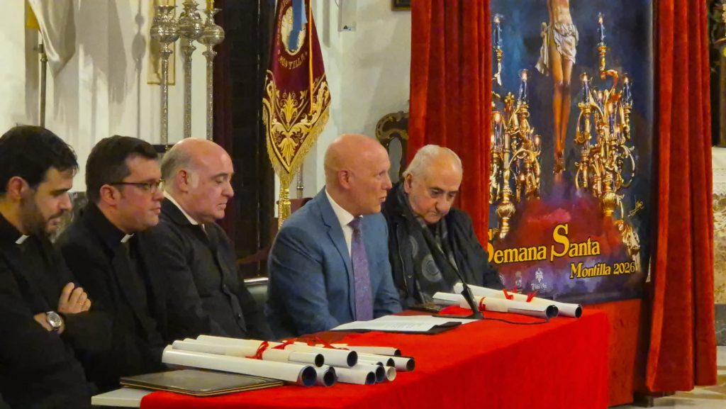 Durante el acto, el presidente de la Agrupación de Cofradías presentó al pregonero, Rafael Delgado, cuya trayectoria cofrade y compromiso con la fe fueron ampliamente destacados. “Es una persona profundamente vinculada a la fe y a la Semana Santa de Montilla, con una trayectoria marcada por el compromiso, la cercanía y el servicio”, afirmó Trapero.