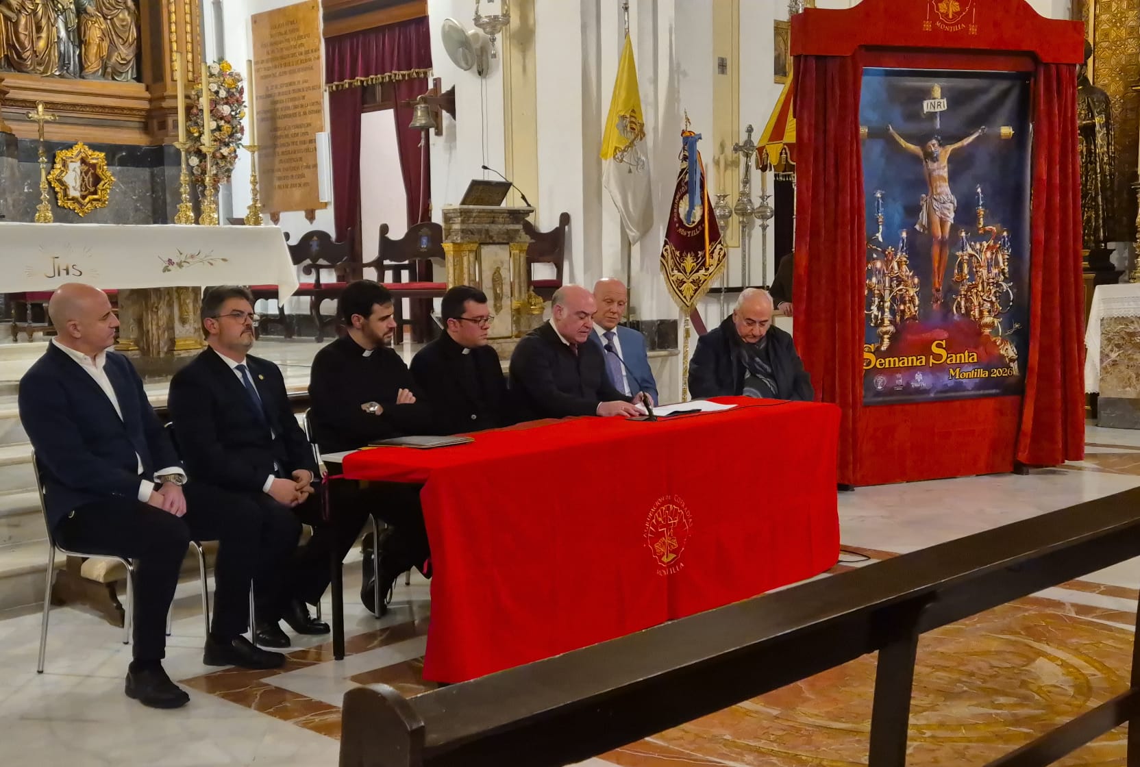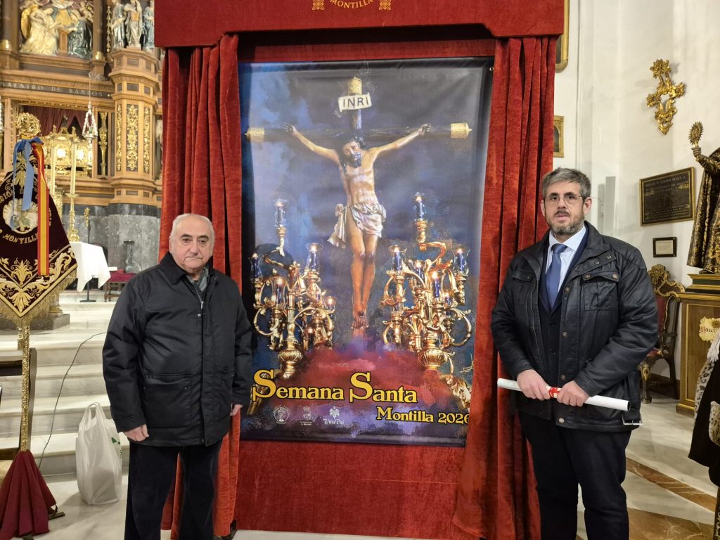 La Basílica de San Juan de Ávila ha acogido la presentación del cartel anunciador de la Semana Santa de Montilla, obra de Jaime Luque, así como el nombramiento del pregonero, Rafael Delgado Portero, quien recibió el título y la carpeta del pregón de manos del pregonero saliente, José Antonio Jurado.