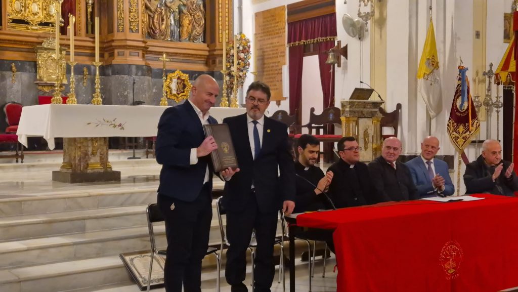 El presidente de la Agrupación entregó a Rafael Delgado el título de pregonero, mientras que la carpeta del Pregón la recibió de manos de José Antonio Jurado, pregonero saliente, quien le recordó que “ser pregonero es un regalo que disfrutarás y recordarás durante toda tu vida”.