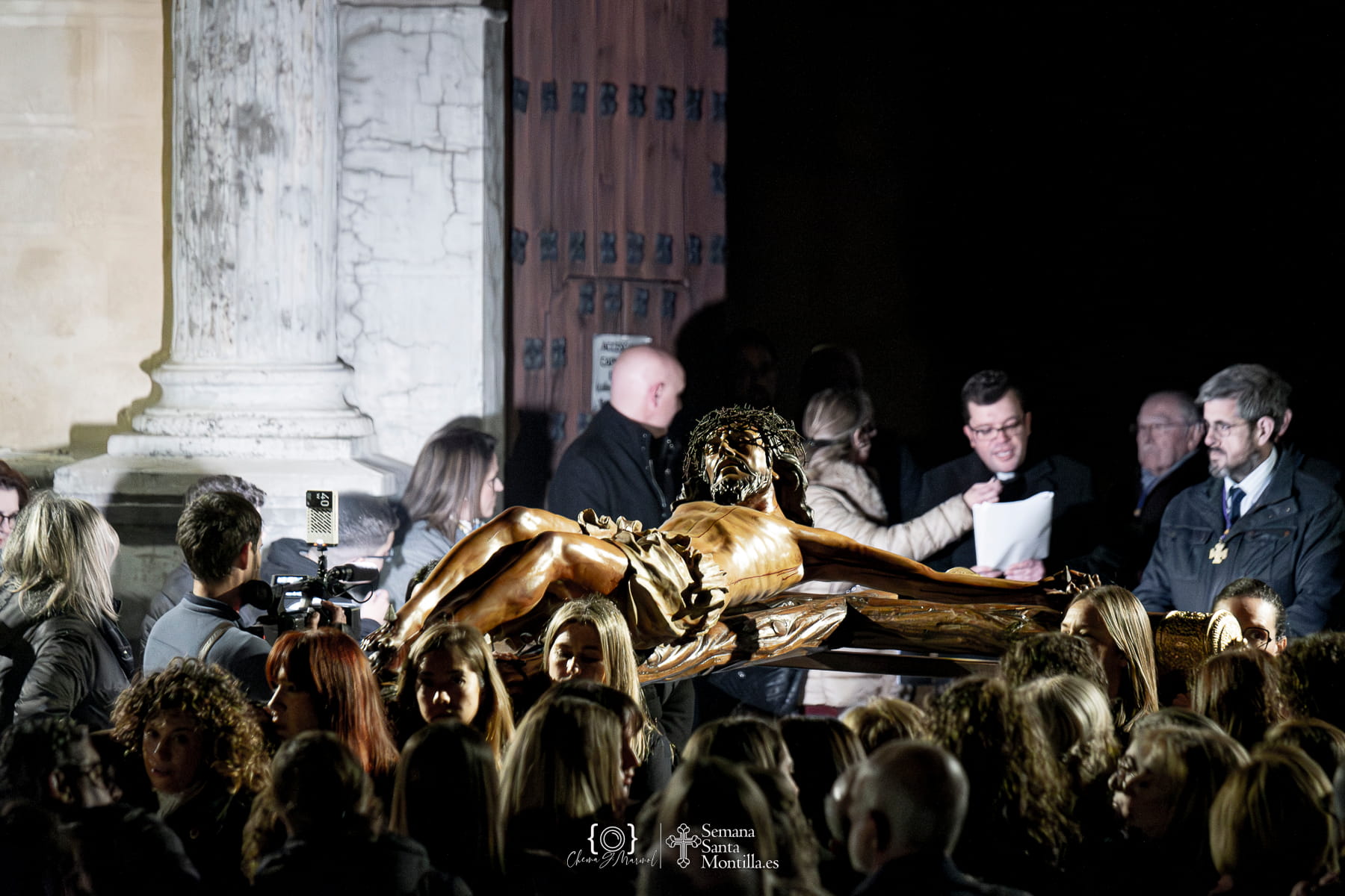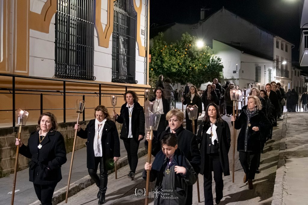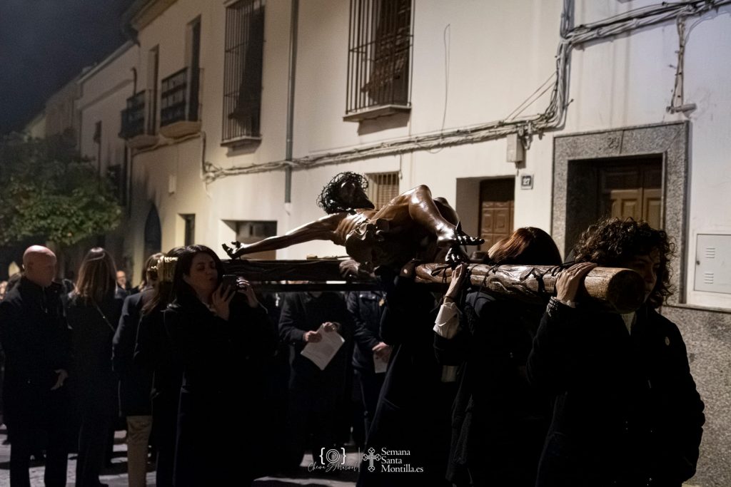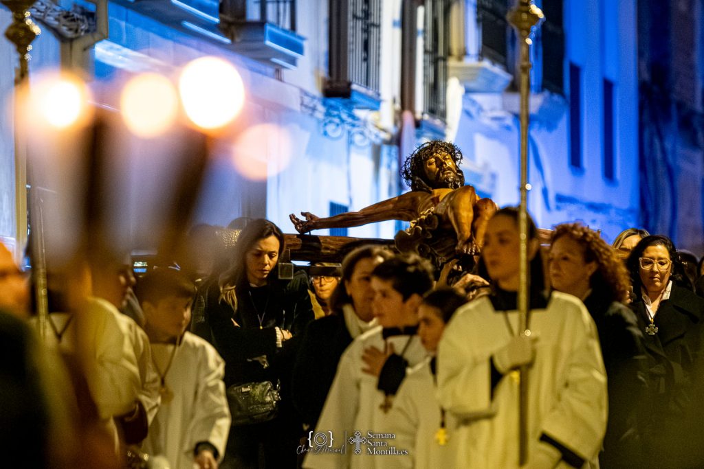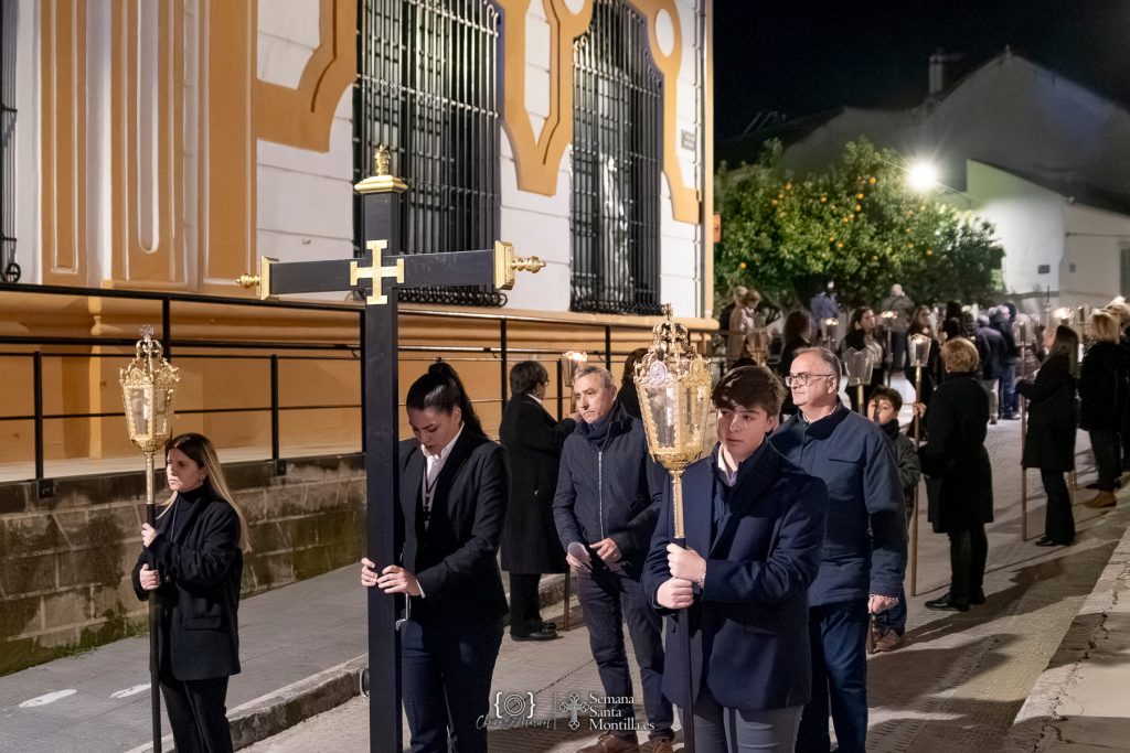 Emotivos momentos los vividos a las puertas de San Agustín, que se han abierto de forma excepcional en el primer viernes de Cuaresma para mostrar la antiquísima imagen del Santísimo Cristo del Perdón que ha presidido el vía crucis penitencial de las cofradías y hermandades montillanas, una fecha clave en el calendario cofrade que anticipa lo que está por llegar a la ciudad y marca el inicio del tiempo de preparación hacia la Semana Santa.