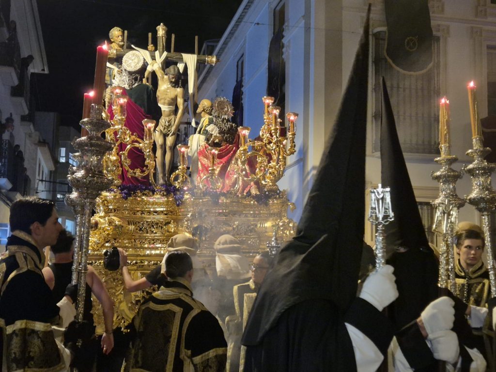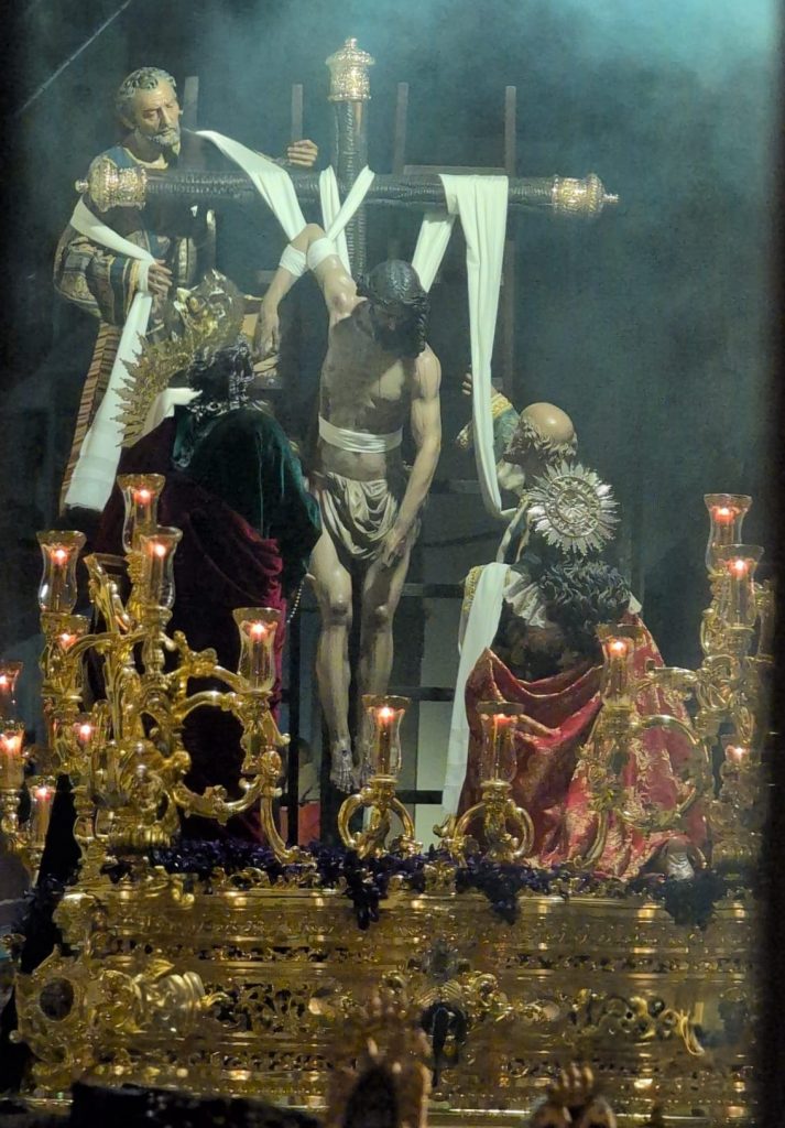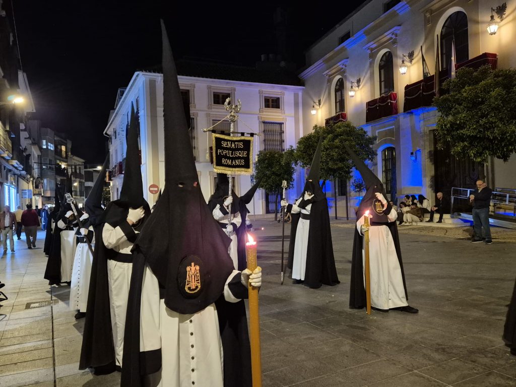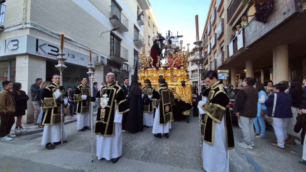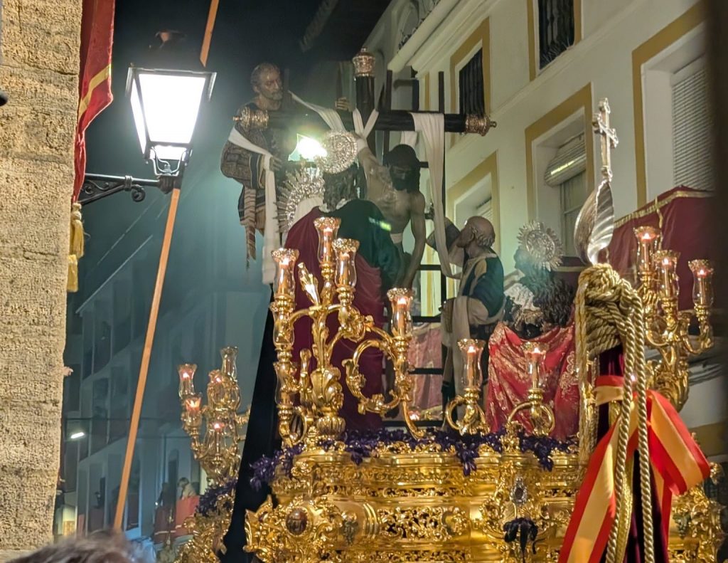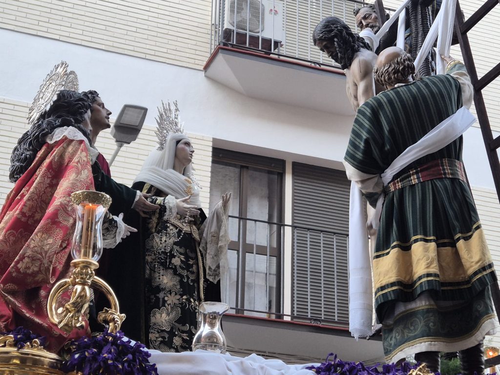 “Nazarenos de capas enlutadas acompañaban el cortejo en un ambiente de respeto sobrecogedor.” El misterio del Descendimiento, obra del imaginero cordobés Antonio Bernal, ofreció una escena de profunda carga emocional: Cristo comienza a ser descendido de la Cruz mientras María Santísima de la Encarnación, rota de dolor, lo espera para acogerlo en su seno. San Juan la sostiene en su dolor, María Magdalena llora a los pies de la Cruz, y José de Arimatea y Nicodemo culminan el descendimiento en una composición que conmueve a cada paso.