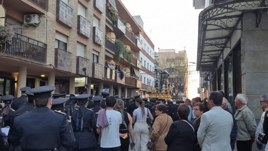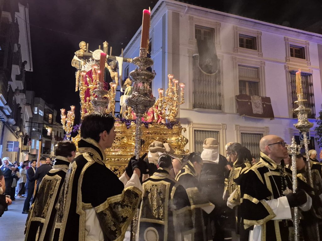A las 19:00 horas, tres golpes secos rompieron el murmullo de la abarrotada calle Fuente Álamo. «Todo se ha cumplido». Las puertas de la capilla se abrieron y el imponente paso de Misterio comenzó a avanzar entre la expectación de cientos de fieles. La saeta de María José Delgado puso voz a los primeros instantes, elevando aún más la intensidad de un momento ya de por sí sobrecogedor.