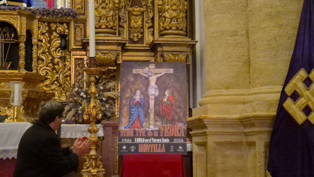 Seguidamente se presentó el cartel conmemorativo del centenario, una pintura realizada por el artista cordobés José María Ariza Castillo, quien no pudo asistir al acto. La obra fue presentada por Ángel Molina, quien explicó que refleja al Cristo de la Liedra con fidelidad histórica y una cuidada composición artística, destacando elementos como la cruz barroca, la corona de espinas y el sudario bordado, en un diálogo visual que evoca la procesión del Viernes Santo y la devoción de los montillanos. La obra combina referencias pictóricas clásicas con un lenguaje contemporáneo, transmitiendo emoción, espiritualidad y la riqueza de la tradición cofrade.