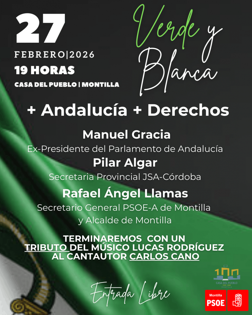 La Agrupación Local del PSOE-A de Montilla celebrará este viernes 27 de febrero, a las 19:00 horas en la Casa del Pueblo, un acto público con motivo del Día de Andalucía bajo el título “+ Andalucía + Derechos”.