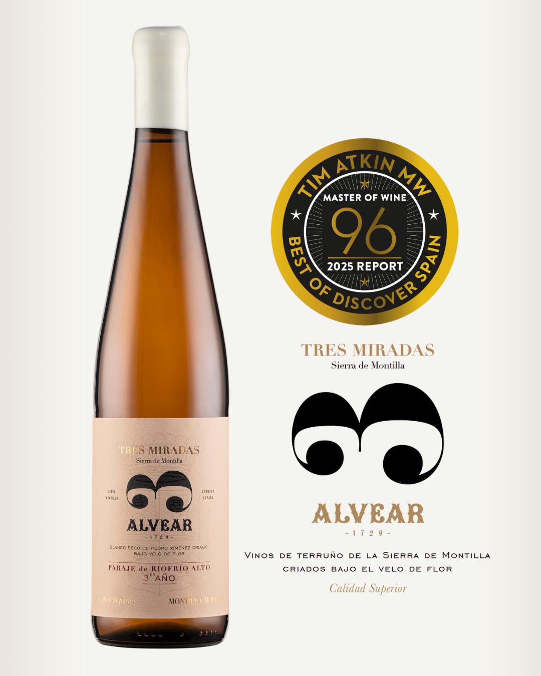 El vino Tres Miradas Paraje de Riofrío Alto 3er Año 2021, de Bodegas Alvear, ha sido distinguido con 96 puntos y el prestigioso título de Vino Revelación del Año Blanco en el informe internacional Discover Spain 2025, dirigido por el crítico británico Tim Atkin MW junto a Beth Willard. Este reconocimiento sitúa al vino de paraje entre los grandes blancos de España, consolidando su posición en el podio de los vinos más destacados del año.