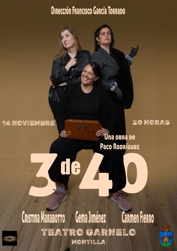 El Teatro Garnelo acogerá este viernes la representación de 3 de 40, a cargo de la compañía cordobesa Arrajatabla Teatro, formada por Cristina Marabotto, Carmen Fierro, y Gema Jiménez bajo la dirección de Paco García Torrado.
