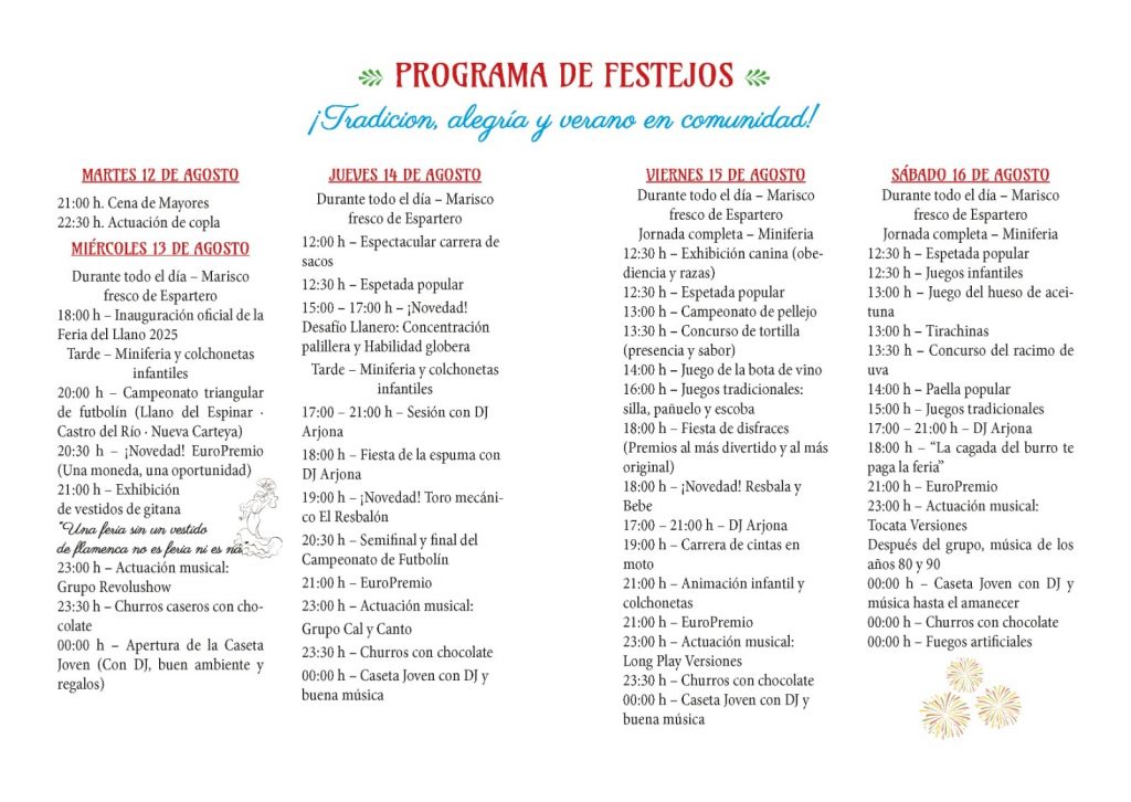 La feria, que cuenta con el patrocinio del Ayuntamiento de Castro del Río, comienza el martes 12, con una cena homenaje a los mayores del Llano del Espinar, y a partir de ahí, se suceden juegos tradicionales, concursos (como el de tortillas o el racimo de uva más grande), fiesta de la espuma, maratón de fútbol, música en directo con grupos como Cal y Canto, Tocada o Play Version, además del inconfundible DJ Arjona, que vuelve a poner ritmo a las tardes.