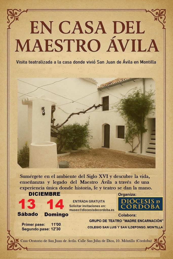 Los días 13 y 14 de diciembre, la casa donde vivió San Juan de Ávila volverá a cobrar vida gracias a la visita teatralizada “En Casa del Maestro Ávila”, una propuesta que transforma la tradicional lectura musical de textos del Santo en una experiencia inmersiva que nos llevará al siglo XVI y a los personajes que llegaban a Montilla atraidos por su palabra y su magisterio. Una oportunidad única para redescubrir la figura del Maestro Ávila en el mismo lugar donde escribió, enseñó y dejó una profunda huella espiritual. .