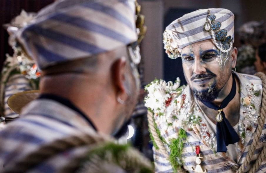 Para dar forma al vestuario de la comparsa, el equipo de Calafat ha realizado un minucioso trabajo de investigación artesanal y conceptual. La premisa era representar al último marinero que habitaba Cádiz cuando todo quedó sumergido por el agua. Referencias al autor Pedro Romero, a la caracola y el estandarte del barrio de La Palma, símbolos del gaditanismo y la historia del Carnaval, se integran en un vestuario cargado de identidad.