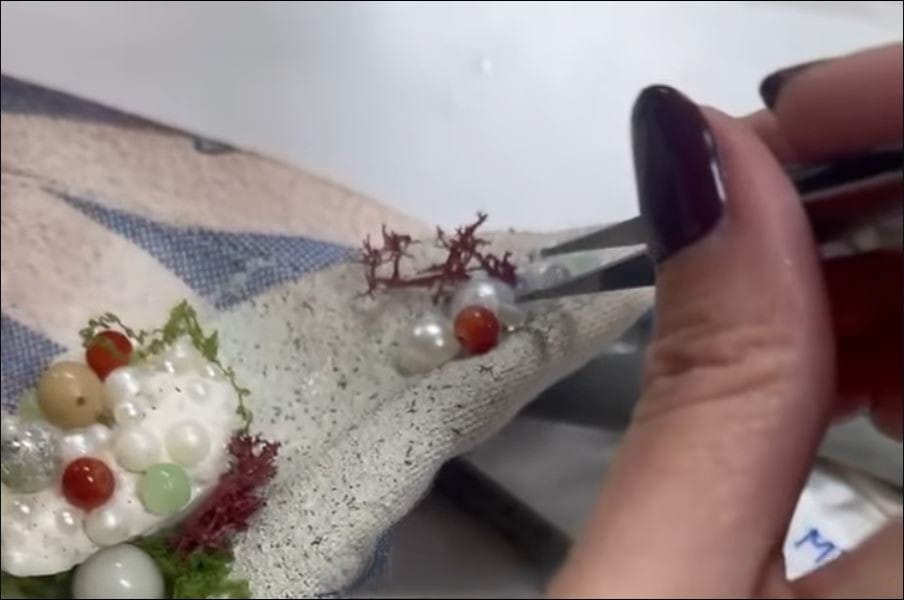 Las rayas del traje incorporan textos con la caligrafía original de Romero, mientras que piedras y elementos marinos, todos residuos naturales, han sido colocados a mano para recrear el paso del tiempo y la huella del mar. Las caracolas, integradas en el hombro, han sido moldeadas sobre el cuerpo de cada componente, con patrones personalizados. Un proceso artesanal que une estética y narrativa escénica.