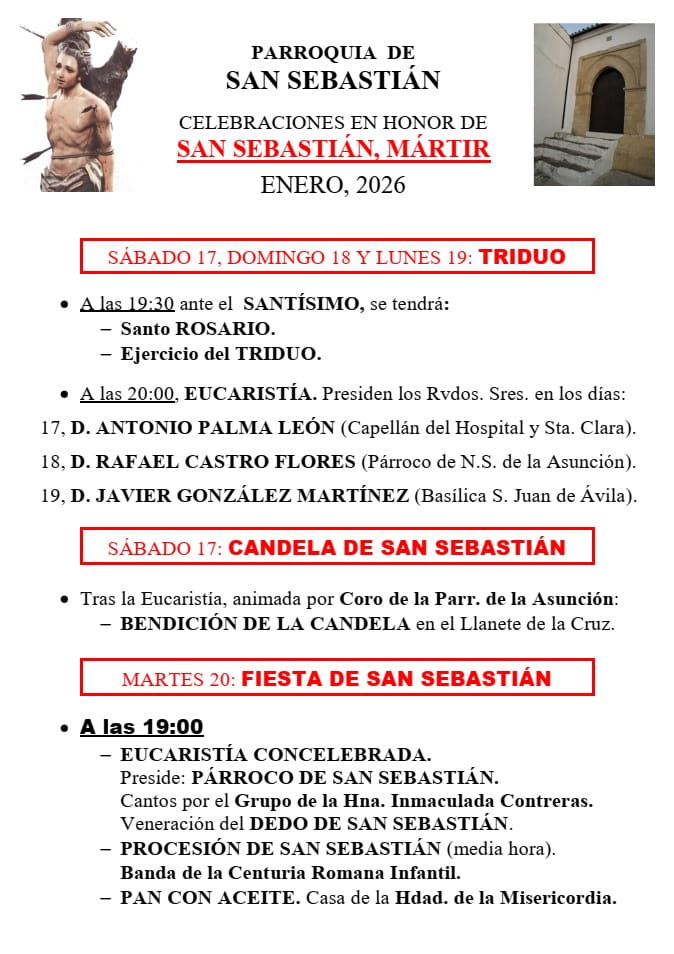 La Parroquia de San Sebastián celebra las tradicionales fiestas en honor a su patrón del 17 al 20 de enero, con actividades que combinan devoción, cultura y convivencia vecinal. Este año la candelá se adelanta al primer día de cultos, el 17 de enero, al coincidir en sábado y para la festividad de San Sebastián, el martes 20, se ha recuperado la procesión que contará con la participación de la Centuria Infantil Romana.