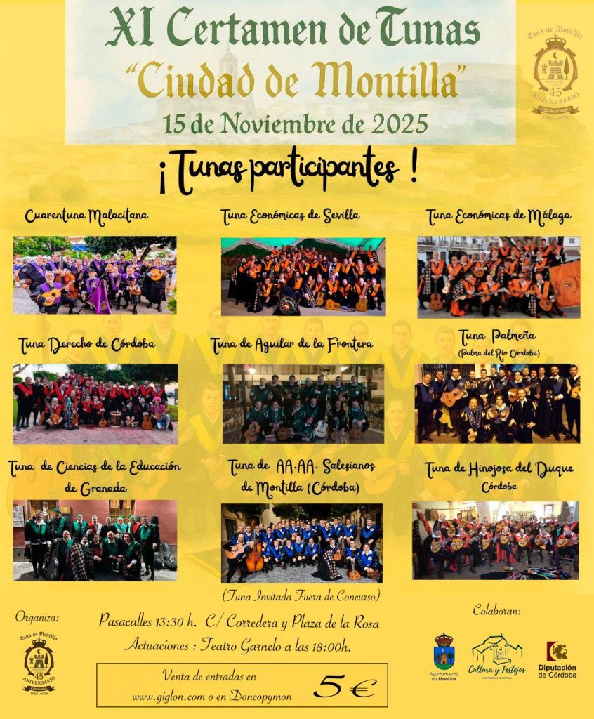 Con motivo de su 45º aniversario, la Tuna de Montilla organiza este sábado un certamen a nivel andaluz que reunirá a 10 tunas y con cerca de 300 tunos que llenarán las calles de música, color y buen ambiente.