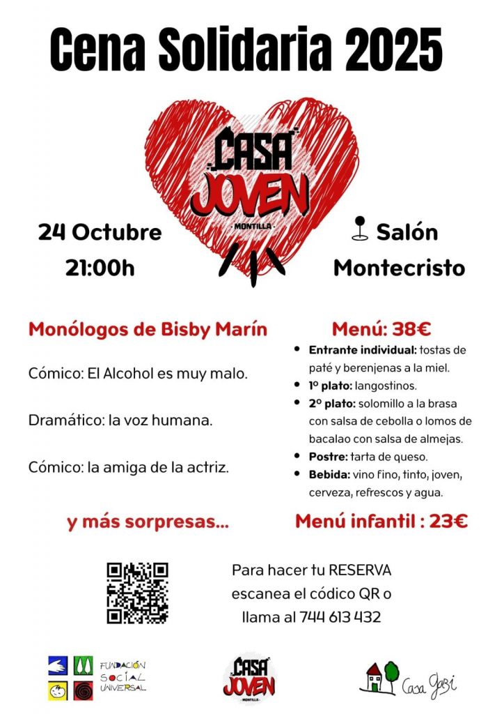 Casa Joven, el proyecto socioeducativo de la Fundación Social Universal, ha organizado una cena solidaria con un objetivo muy claro: implicar a la ciudadanía de Montilla en el acompañamiento y apoyo a jóvenes en situación de vulnerabilidad. La cita será el 24 de octubre, a las 21:00 horas, en el Salón Monte Cristo, y todo lo recaudado se destinará a fortalecer el trabajo que el equipo desarrolla cada tarde con chicos y chicas que buscan construir un futuro mejor.