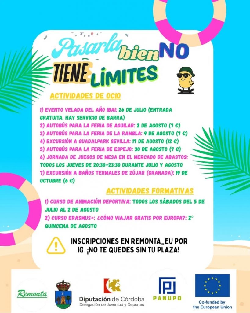 La Asociación Juvenil Remonta, con el apoyo del Área de Juventud de la Diputación de Córdoba y la colaboración logística del Ayuntamiento de Montilla, lanza este verano el proyecto “Pasarla bien no tiene límites”. Un programa pensado por y para jóvenes, con planes que van desde excursiones refrescantes hasta formación para viajar por Europa, pasando por noches de feria seguras y ocio alternativo en pleno corazón de Montilla.