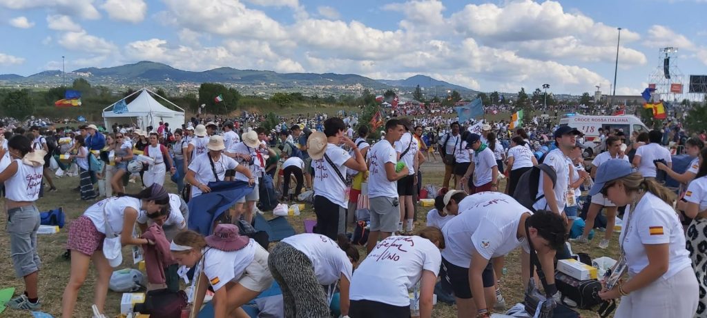 Tras aterrizar, Papa recorrió parte del recinto saludando a los millones de jóvenes que allí se encontraban. A continuación, dio comienzo la vigilia de oración, en la que sobrecogió el silencio ante la adoración de jóvenes delante del Señor. Aquel campo enorme se convirtió en un tabernáculo con millones de corazones adorando a Jesús Eucaristía, ni un grito, ni interrupciones, solo silencio y adoración.