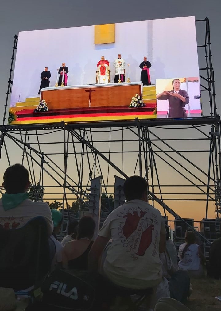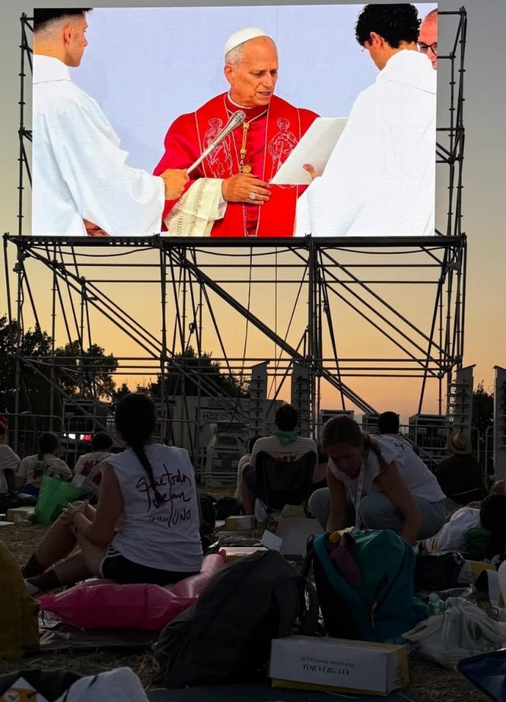A las 7.45horas del domingo cuando, con los primeros rayos del Sol, León XIV volvió al encuentro de los jóvenes, como ese que nace de lo alto cada mañana. Y allí, como Iglesia universal, nos reunimos para la celebración de la Eucaristía, adornada por una preciosa liturgia y unos cantos que encendían los corazones de todos los jóvenes.