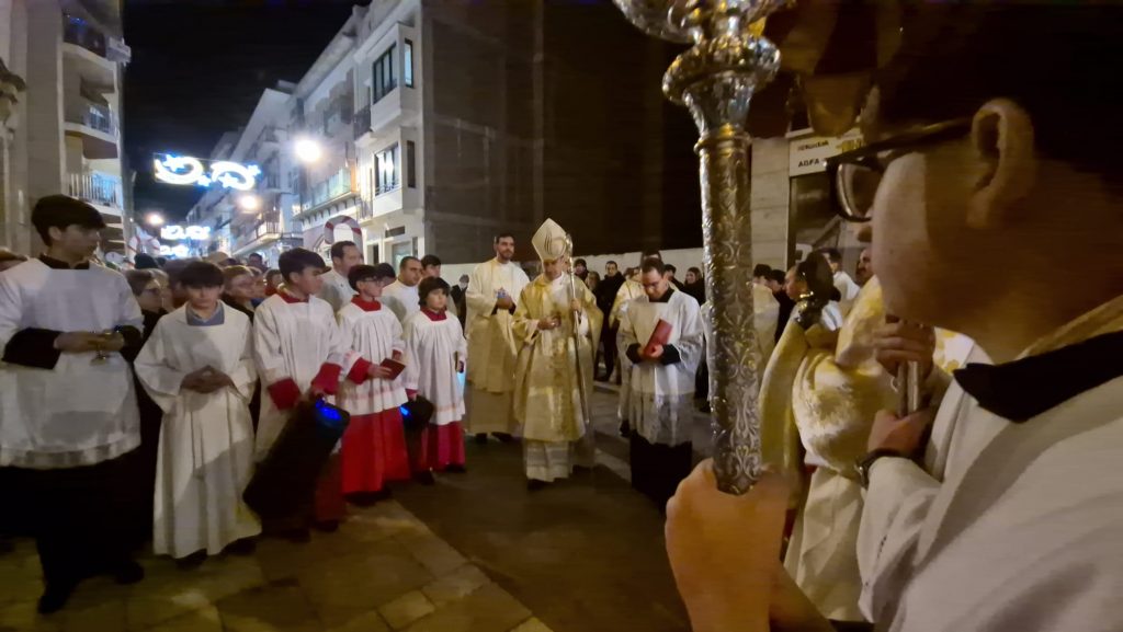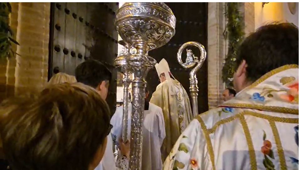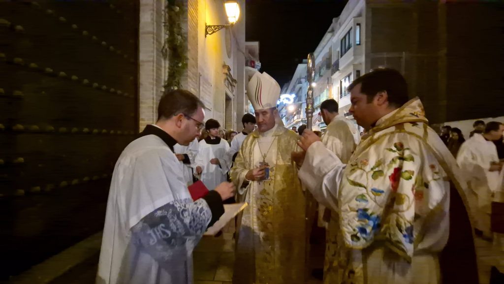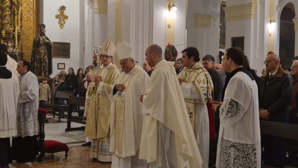 Tras partir en procesión con las reliquias del Maestro de Santos, desde la Casa de Cáritas, el obispo monseñor Jesús Fernández llegó a las puertas de la Basílica acompañado por el obispo emérito, monseñor Demetrio Fernández, así como por el rector y vicerrector del templo, junto a numerosos sacerdotes de la diócesis de Córdoba.