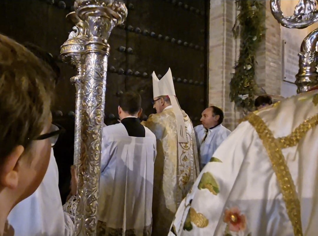 Tras las oraciones iniciales, monseñor Jesús Fernández abrió la Puerta Santa, mientras resonaban los cantos del Coro del Seminario San Pelagio de Córdoba, acompañados por el organista Manuel Pareja.