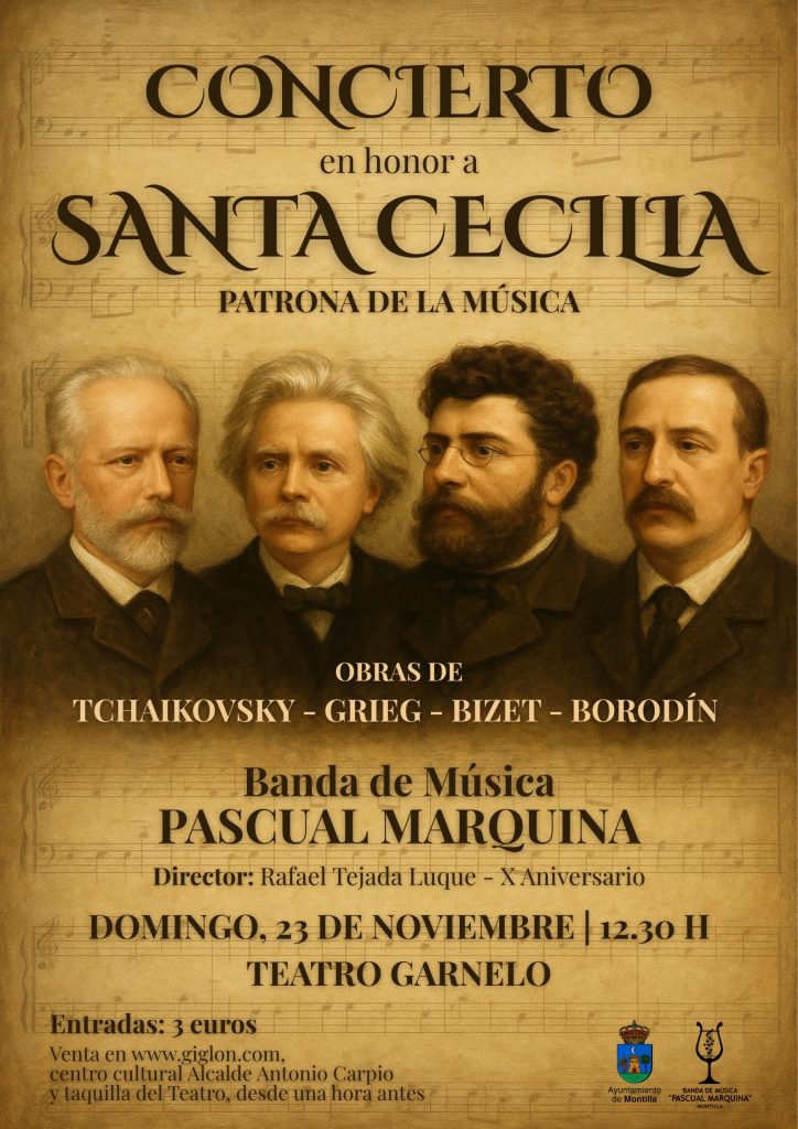 El domingo 23 de noviembre, el Teatro Garnelo acogerá a partir de las 12.30 horas el tradicional concierto que la Banda de Música Pascual Marquina ofrece cada año en honor a Santa Cecilia, patrona de la música. Se trata de una de las citas más esperadas por la formación y por el público montillano.