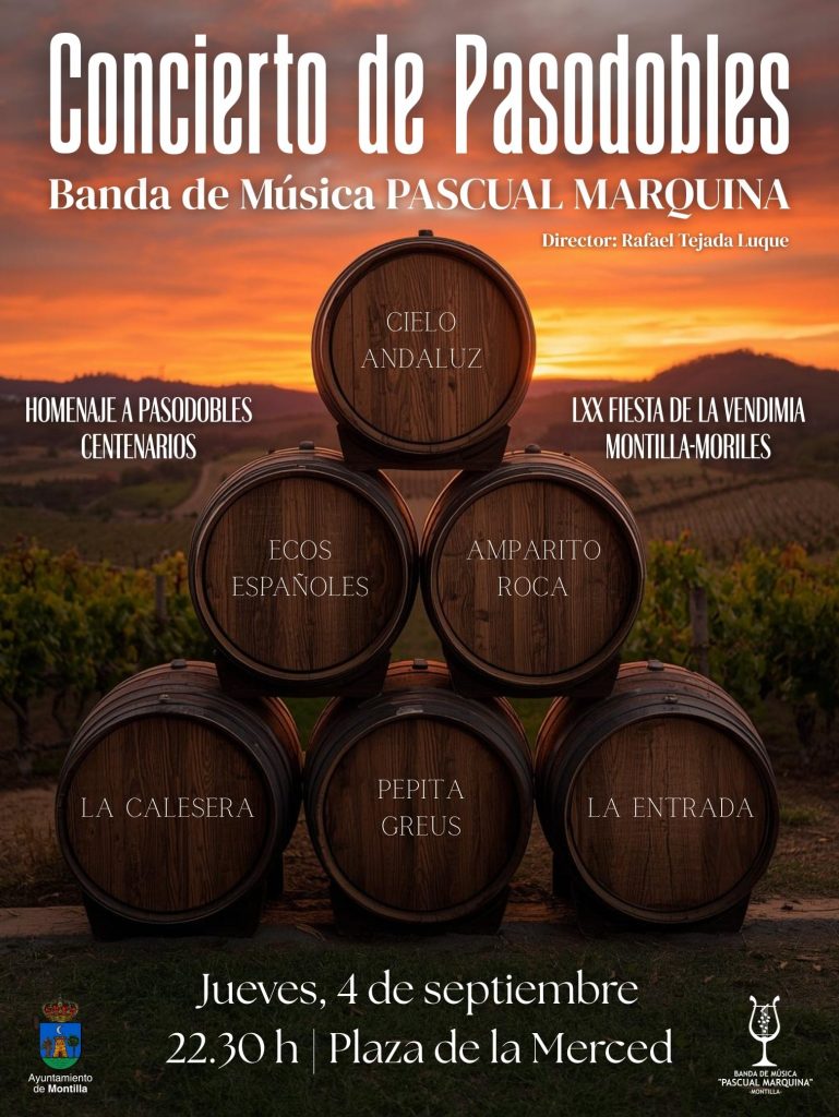 La Banda de Música Pascual Marquina volverá a formar parte de la programación de la LXX Fiesta de la Vendimia Montilla-Moriles con su ya tradicional concierto de pasodobles, una cita muy esperada que se celebrará el próximo jueves 4 de septiembre, a las 22:30 horas, en la Plaza de la Merced.
