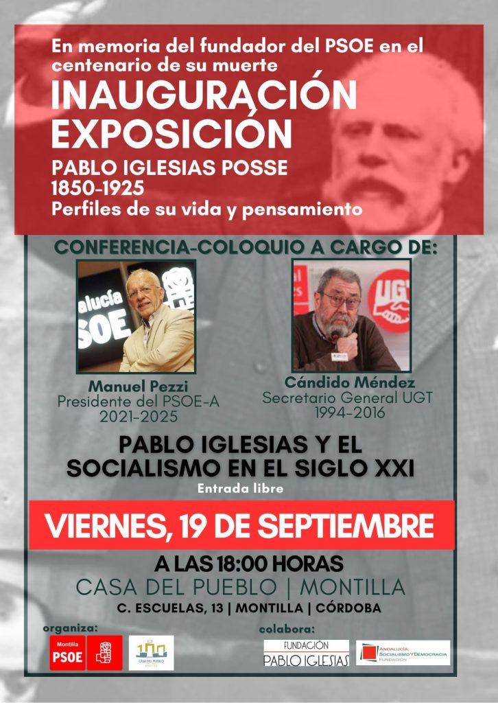 El PSOE-A de Montilla celebrará este viernes, 19 de septiembre, a las 18:00 horas, en la Casa del Pueblo, un acto conmemorativo en memoria de Pablo Iglesias Posse, fundador del Partido Socialista Obrero Español y de la Unión General de Trabajadores, con motivo del centenario de su fallecimiento.