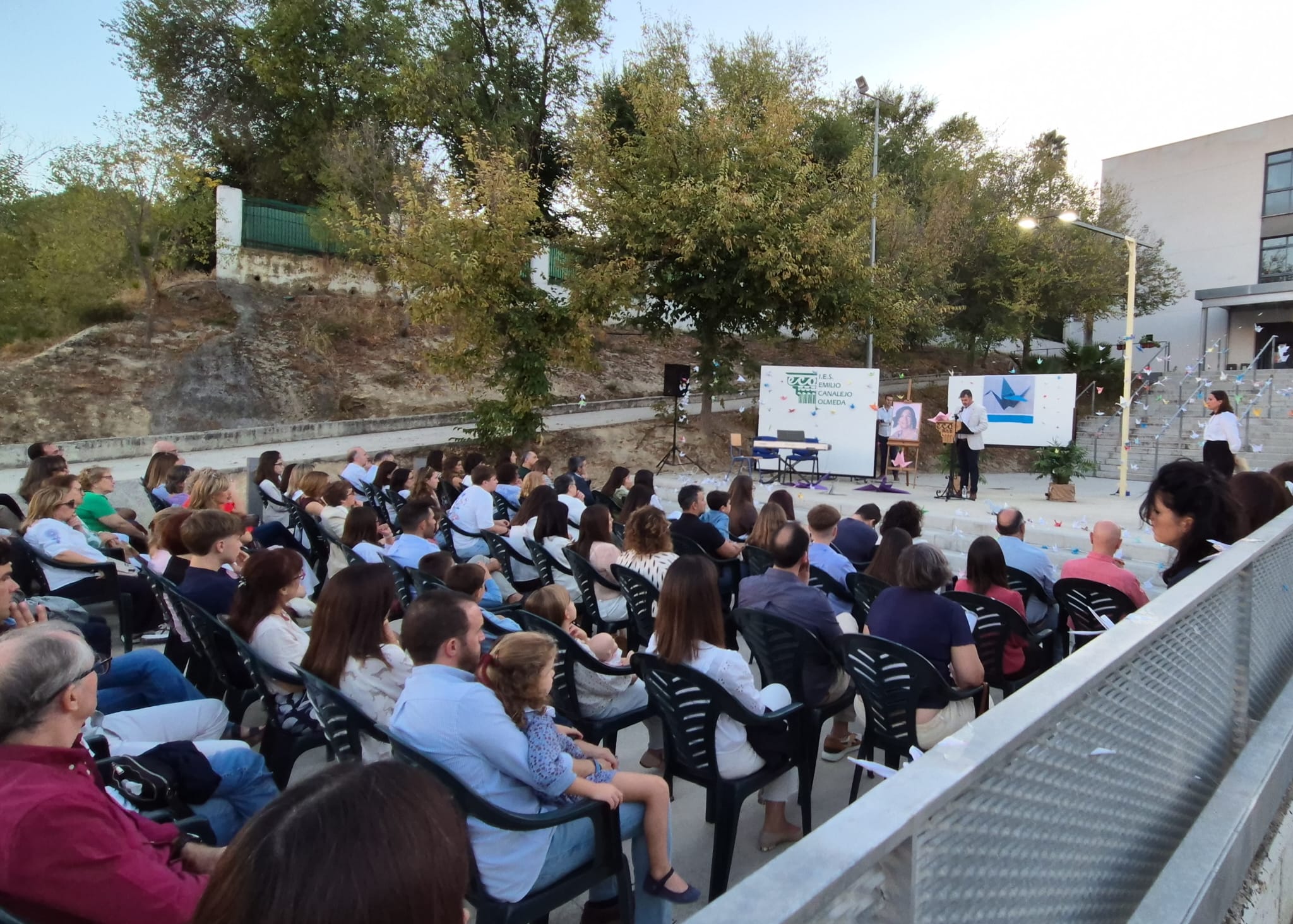 El homenaje, celebrado en el patio del IES Emilio Canalejo, reunió a numerosos compañeros, alumnado, familiares, amigos y representantes municipales, que quisieron recordar la figura de una profesora apasionada de la educación, amante de las matemáticas y profundamente querida.