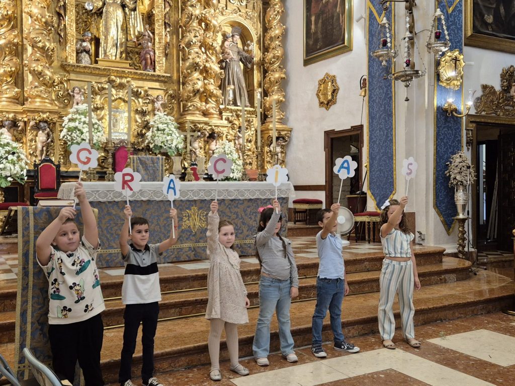 En el atrio del templo se han expuesto los dibujos realizados por el alumnado, participantes en un concurso escolar. De entre ellos, se ha elegido la imagen ganadora, que ha sido utilizada para ilustrar la estampa conmemorativa que se ha entregado a todos los escolares como recuerdo de esta jornada tan especial.