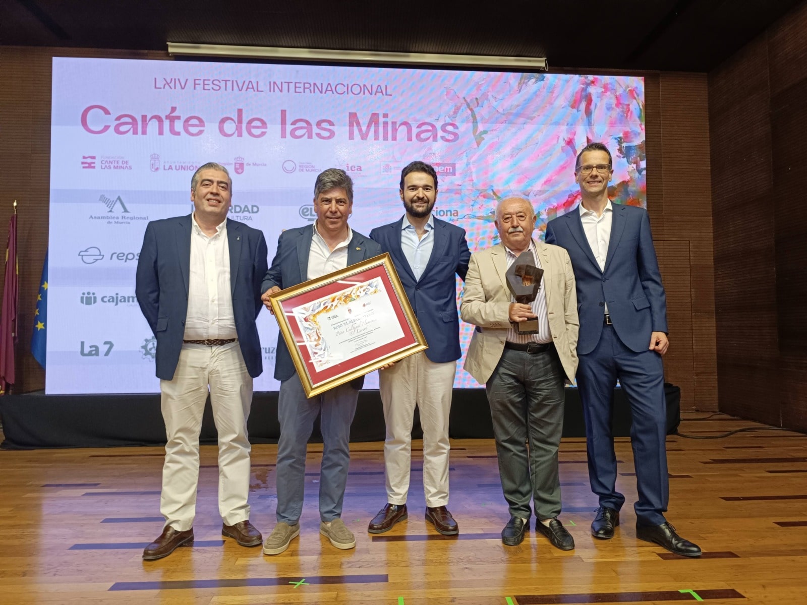 El alcalde, Rafael Llamas, junto al presidente de la Peña Flamenca “El Lucero”, Salvador Córdoba; Félix Contreras, miembro de la directiva de la Peña; y el concejal de Turismo, Adrián Lapsley, recogieron el galardón en el acto celebrado en el Nuevo Museo Minero de La Unión (Murcia).
