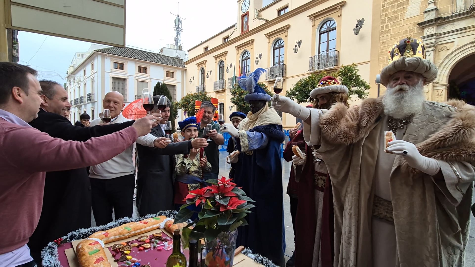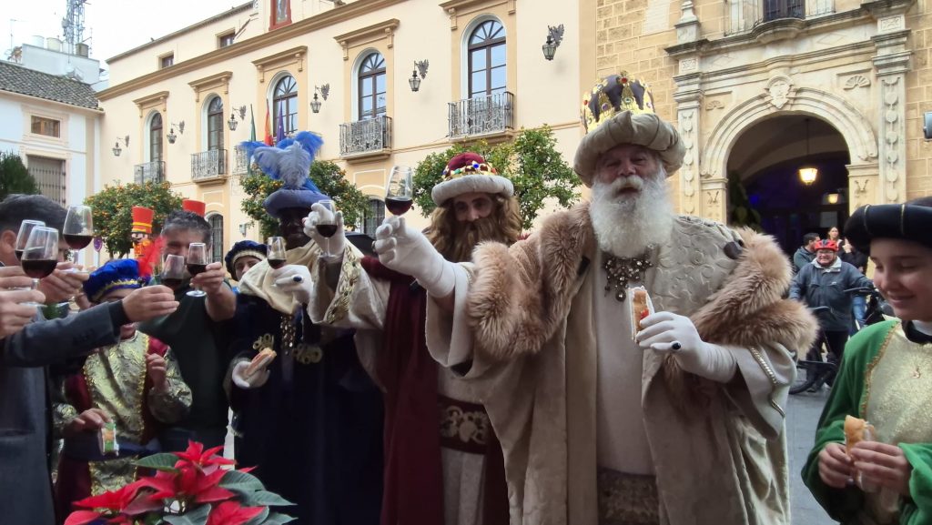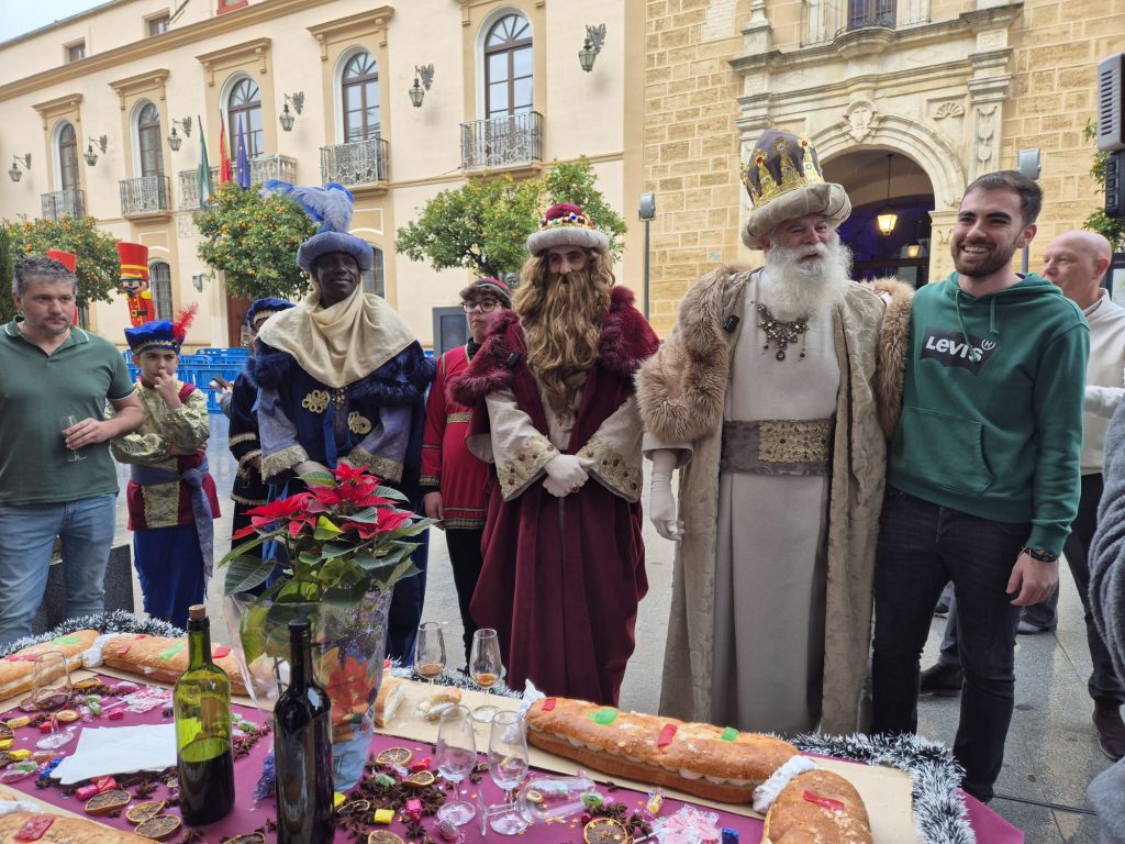 Sus Majestades los Reyes Magos, acompañados por el alcalde, el Hermano Mayor, el delegado de Festejos y miembros de la Hermandad de la Humildad y Caridad de Montilla, han inaugurado el Roscón Gigante y han brindado con Pedro Ximénez para trasladar sus mejores deseos a la ciudad.