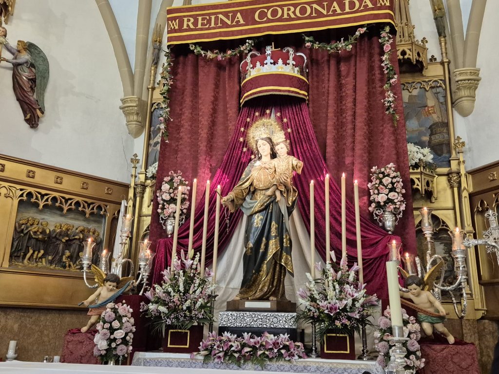 La imagen se ha situado en el altar bajo un dosel con una gran corona que recuerda la efeméride y desde donde podremos contemplarla desde esta tarde en su santuario.