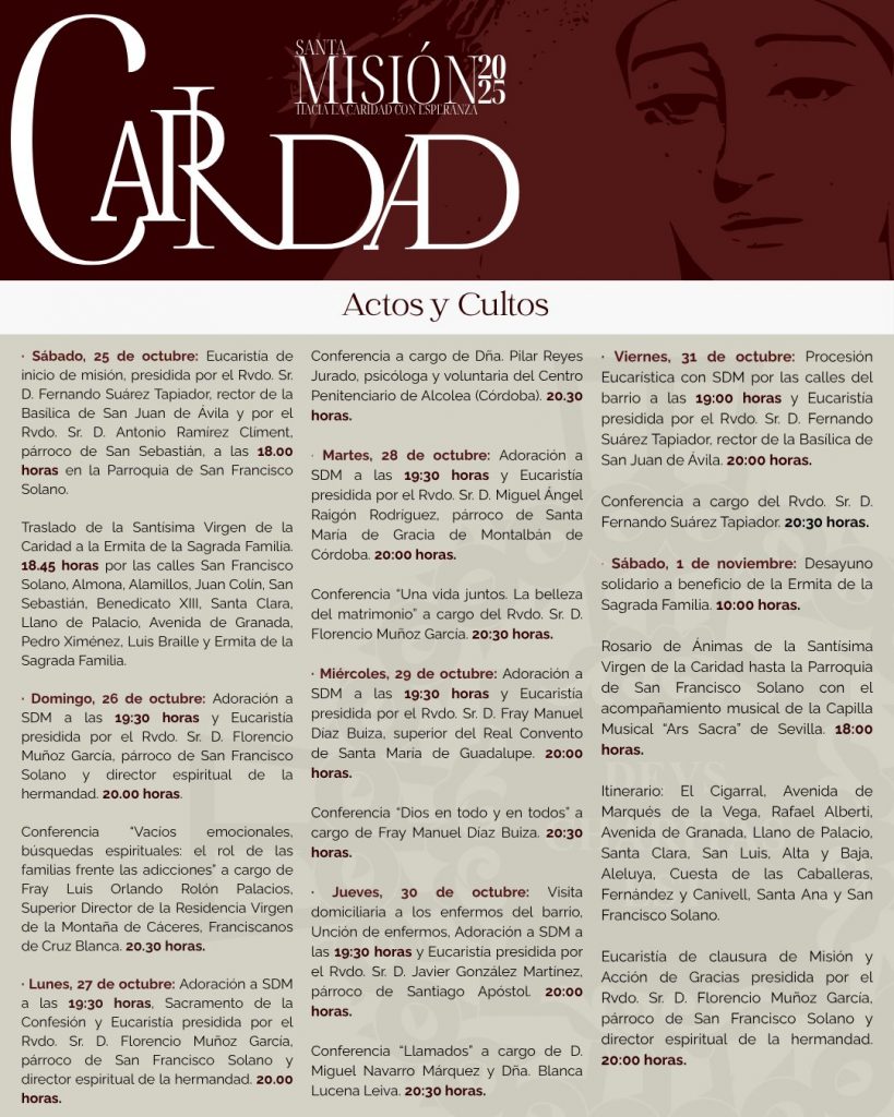 La clausura de la misión tendrá lugar el 1 de noviembre, con una estación de penitencia y Rosario de Ánimas, acompañando a la Virgen de regreso a San Francisco Solano. A las 10:00 h. Desayuno solidario a beneficio de la Ermita de la Sagrada Familia. Por la tarde a las 18:30h Rosario de Ánimas, con la María Santísima de la Caridad en sus Tristezas, de regreso a su parroquia, acompañada por la Capilla Musical Ars Sacra (Sevilla). Itinerario: El Cigarral, Avenida de Marqués de la Vega, Rafael Alberti, Avenida de Granada, Llano de Palacio, Santa Clara, San Luis, Alta y Baja, Aleluya, Cuesta de las Caballeras, Fernández y Canivell, Santa Ana y San Francisco Solano. A las 20:00h Eucaristía de Clausura de la Misión y Acción de Gracias presidida por el Rvdo. Florencio Muñoz, párroco de San Francisco Solano.