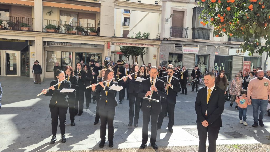 A las 12:00 horas llegaba al Ayuntamiento la Banda Pascual Marquina, tras realizar el tradicional pasacalles por distintos barrios de la localidad interpretando pasodobles de desfile para anunciar la celebración del 46 aniversario de la autonomía andaluza. Ya en el interior del patio, la banda se situó en los balcones desde donde ofreció un primer pasodoble que dio paso al acto institucional.