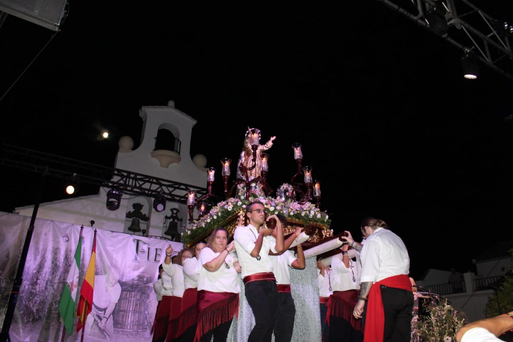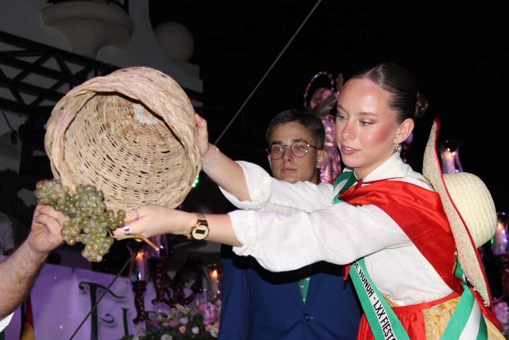 El mosto extraído fue recogido por los vendimiadores mayores, Inmaculada Jiménez y Manuel Cardeñosa, y ofrecido a la Virgen de las Viñas por el consiliario de la Hermandad, Rafael Castro.