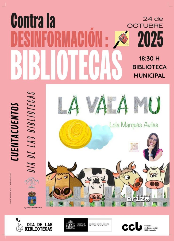 Bajo el lema “Contra la desinformación: bibliotecas”, la Biblioteca Municipal acogerá a partir de las 18:30 horas un cuentacuentos infantil a cargo de la escritora Lola Marqués Avilés, quien presentará su divertida y entrañable obra “La vaca Mu”.