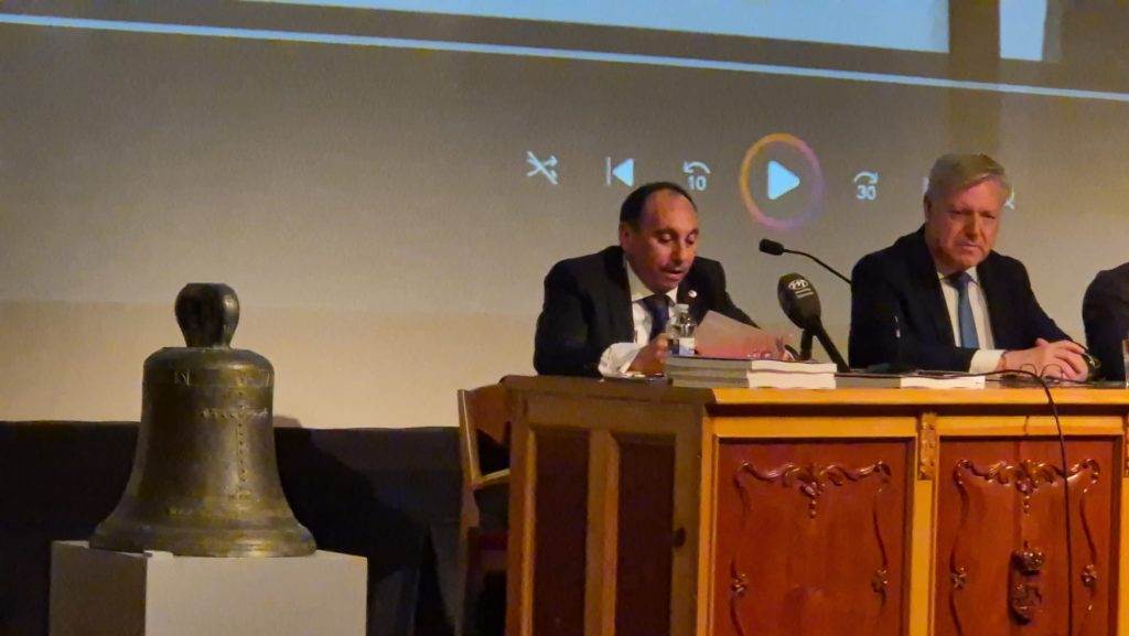Durante su intervención, Primo Jurado destacó el valor patrimonial de las campanas y su estrecho vínculo con la vida de los pueblos: “El canto y el sonido de las campanas forman parte del patrimonio material de nuestros pueblos. Son bienes muebles con una larguísima historia; aquí hablamos de 50 campanas, la más antigua del siglo XVI. Pero, además, existe un patrimonio inmaterial asociado a ellas: los antropólogos estudian cómo los toques han acompañado las circunstancias de nuestra vida —las horas, la alegría, la tristeza, los entierros.