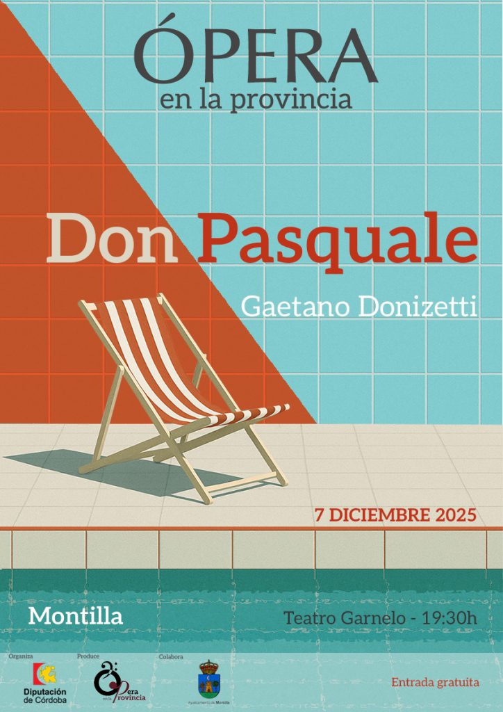 La ópera Don Pasquale se pondrá en escena en los municipios de Priego de Córdoba (5 de diciembre, Teatro Victoria), Palma del Río (6 de diciembre, Teatro Coliseo), Montilla (7 de diciembre, Teatro Garnelo) y Montoro (8 de diciembre, Teatro Municipal Miguel Romero Esteo). Todas las representaciones serán a las 19.30 horas, excepto la que tendrá lugar en Montoro, que será a las 19 horas.