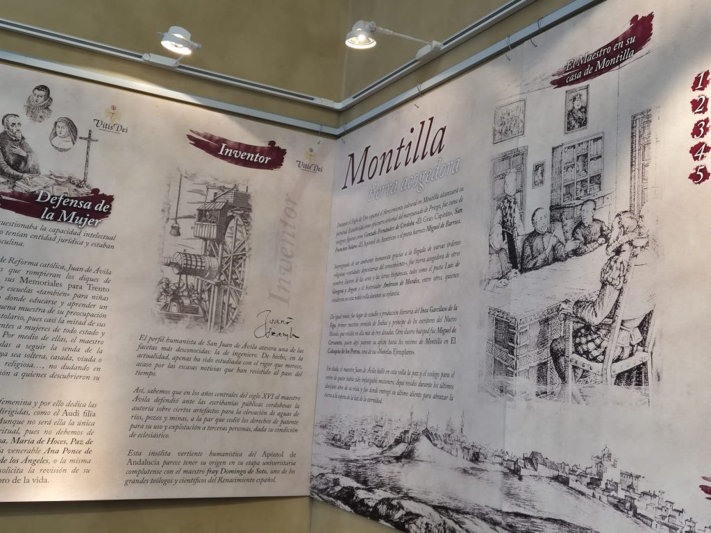 La muestra, comisariada por el historiador Antonio Luis Jiménez, lleva por título Montilla fue su escuela y está concebida como una introducción a la vida y obra del santo y a la Ruta Avilista Vitis Dei. Según explicó, la exposición se articula en varios paneles que recorren su biografía, los principales hitos de su trayectoria, los lugares por los que pasó como sacerdote y sus distintas facetas como humanista del Renacimiento: la literaria, la asistencial, su defensa de la mujer y su menos conocida faceta como ingeniero e inventor. La muestra concluye con un espacio dedicado a Montilla como “tierra acogedora” y a los principales enclaves avilistas de la ciudad.