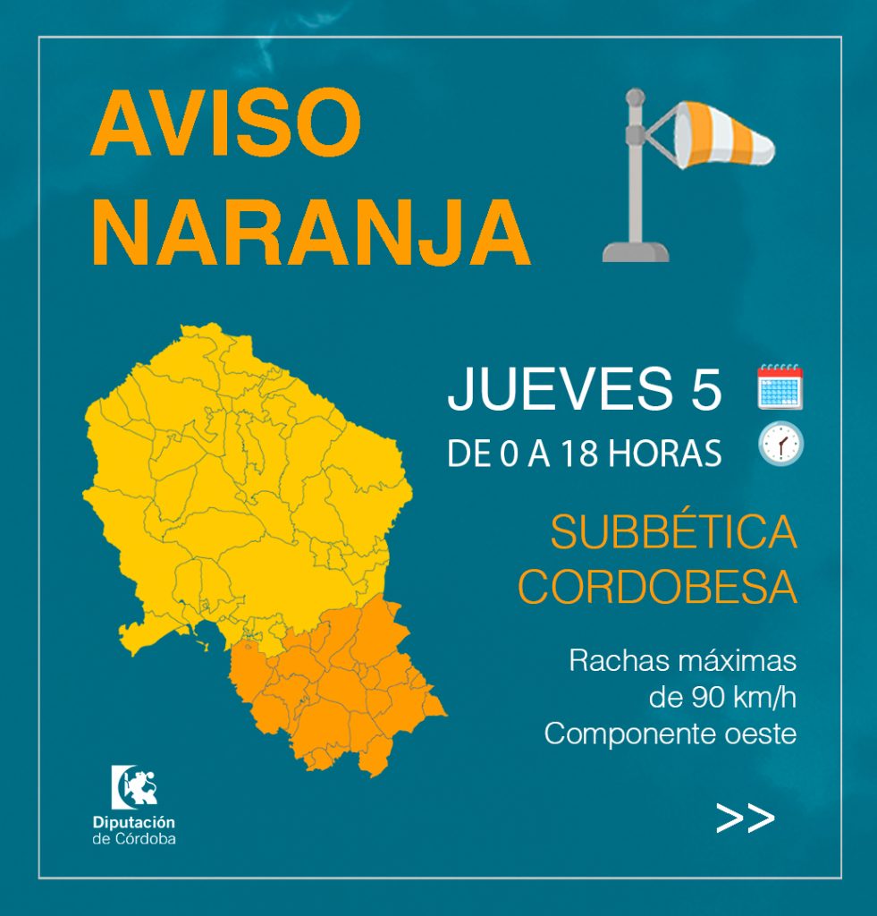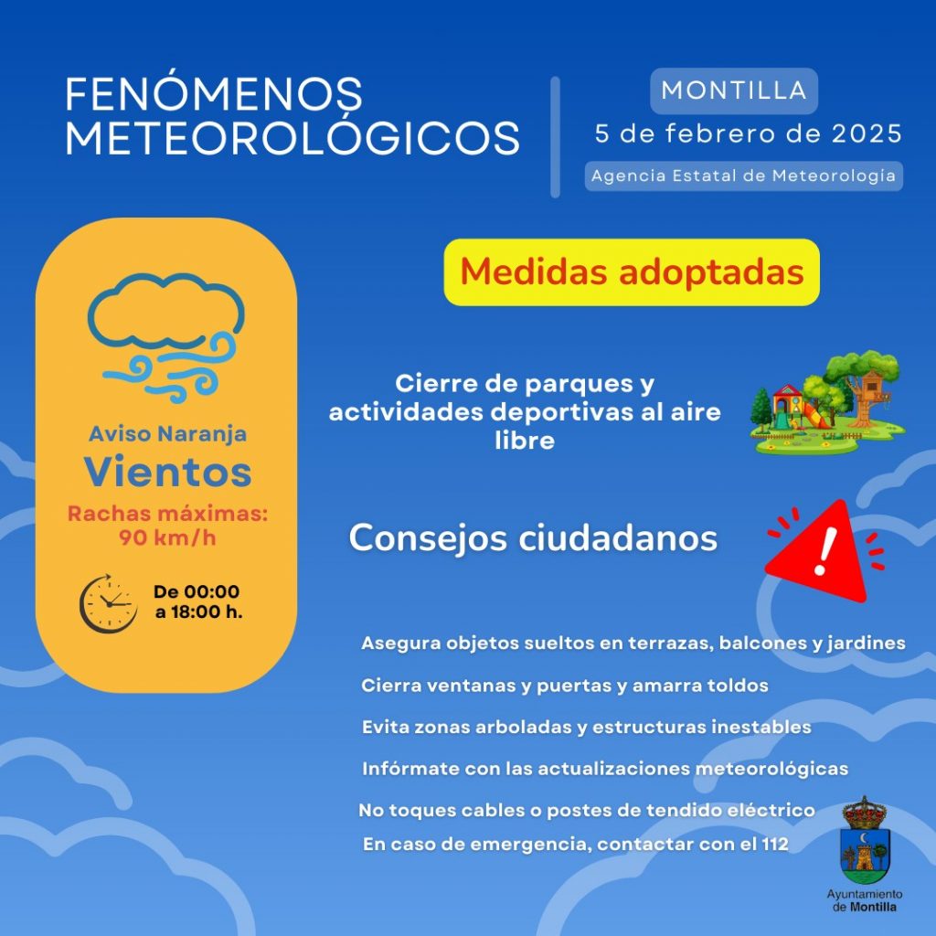 Para mañana jueves la AEMET pone en alerta naranja por viento a Montilla. Se prevén rachas de hasta 90 km/h, por lo que el Ayuntamiento de Montilla continúa con medidas preventivas como el cierre de parques y actividades deportivas al aire libre.