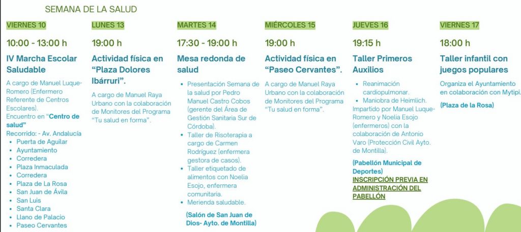 La programación de la Semana de la Salud arrancó el pasado viernes con una marcha saludable que reunió a más de 400 escolares y ha continuado a lo largo de estos días con distintas actividades dirigidas a todos los públicos. Entre ellas, sesiones de actividad física en espacios abiertos como la Plaza Dolores Ibárruri o el Paseo Cervantes, una mesa redonda sobre salud, talleres de risoterapia y de etiquetado de alimentos, así como una merienda saludable celebrada en el Salón de San Juan de Dios. El programa se completa con un taller de primeros auxilios —con formación en reanimación cardiopulmonar y maniobra de Heimlich— en el Pabellón Municipal de Deportes, y un taller infantil de juegos populares en la Plaza de la Rosa, configurando una propuesta variada que combina ejercicio, formación y convivencia en torno a hábitos de vida saludables.