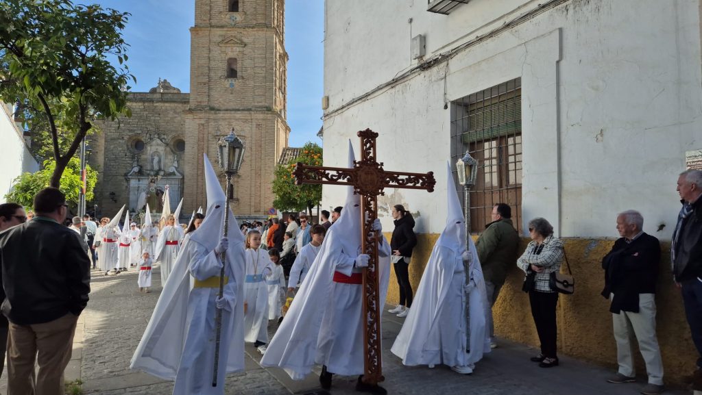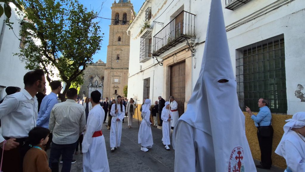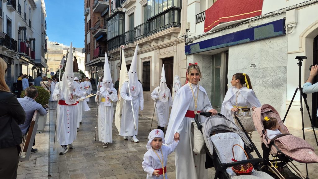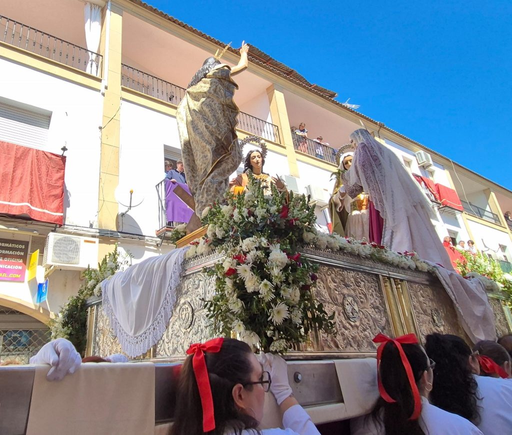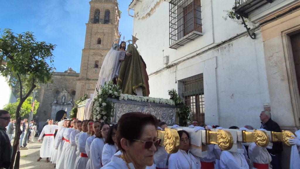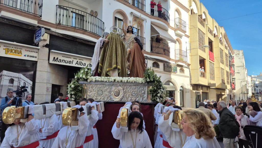A las 10:30 horas de este Domingo de Resurrección, hacía su salida de la Parroquia de Santiago el paso de misterio de Jesús Resucitado y las Santas Mujeres —María Magdalena, María Salomé y María de Cleofás—, marcando el inicio de la jornada con el solemne toque de gloria de las campanas. Este paso, que evoca la alegría del Encuentro, llama la atención por su belleza e invita a la reflexión sobre la victoria de la vida sobre la muerte.