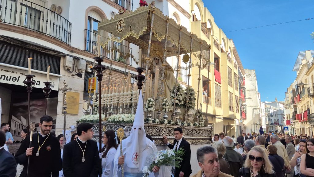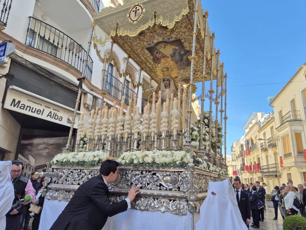Tras este paso, Nuestra Señora de la Paz con su sonrisa serena y la belleza que le imprimió el imaginero Antonio Bernal, autor también de las tres marías, avanzaba radiante con su manto dorado simbolizando la esperanza y la serenidad tras el dolor de la Pasión.