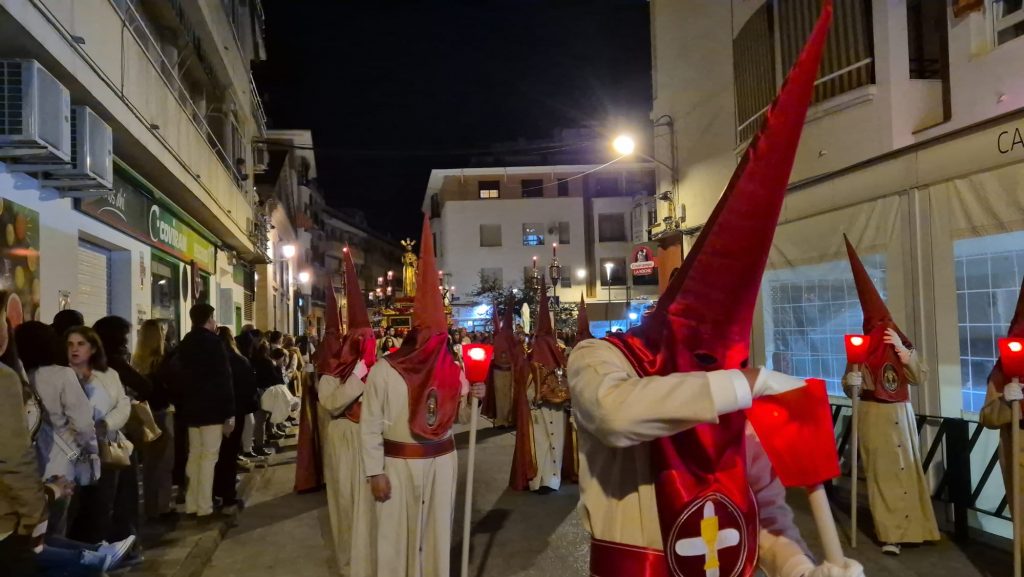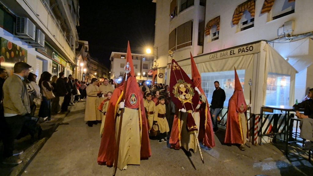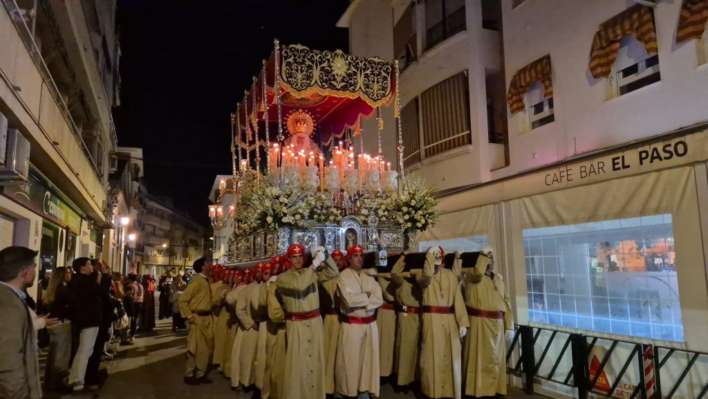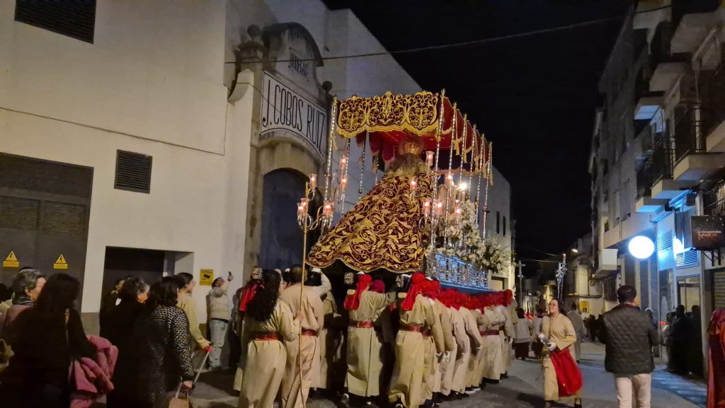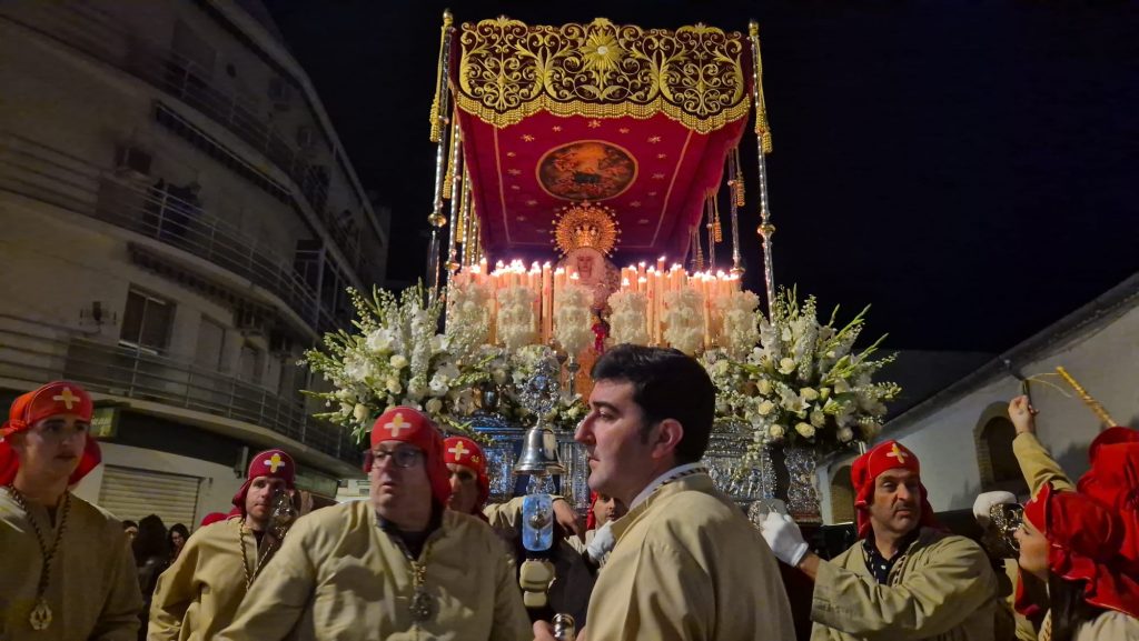 La hermandad, profundamente vinculada al barrio del Gran Capitán, recorrió sus calles antes de dirigirse hacia el centro de la localidad, adentrándose en el casco histórico por calle La Parra y Fuente Álamo hacia la Plazuela de la Inmaculada. A su paso, no faltaron las muestras de cariño, con las voces de los costaleros rompiendo el silencio al grito de “¡Estrella, guapa!”, convertido ya en seña de identidad de la corporación.