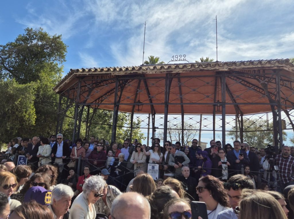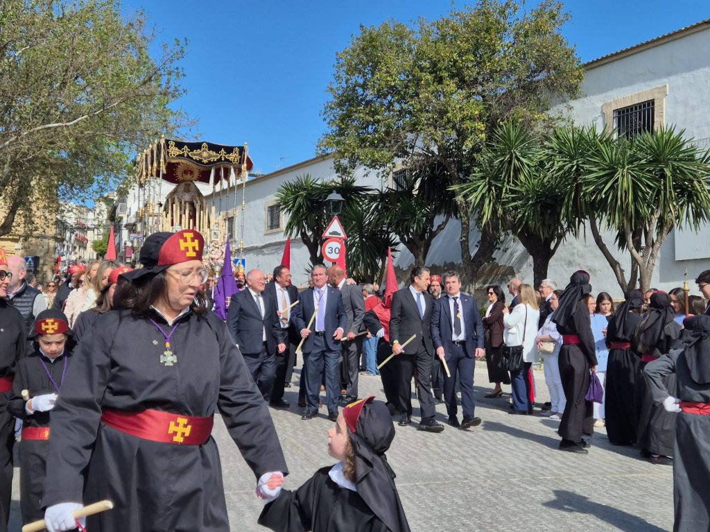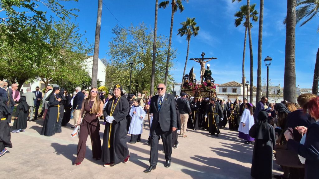 La esperada salida fue un auténtico estallido de fe y devoción. Jesús ‘Rescatao’, Nuestro Padre Jesús Nazareno, el Santísimo Cristo de la Yedra y María Santísima de los Dolores abandonaron su templo en brazos de sus costaleros, ya que las dimensiones de la puerta no permiten que los pasos salgan montados. Esto permitió a los presentes disfrutar de las imágenes desde muy cerca, casi rozando la devoción. Una vez preparados salieron de San Agustín entre una bulla respetuosa y emocionada, envueltos en esa luz de la mañana que realza cada detalle, cada mirada, cada plegaria. El cortejo se dirigió hacia el Paseo de Cervantes, donde tuvo lugar uno de los momentos más íntimos y esperados: las bendiciones del Nazareno y la Virgen de los Dolores, un instante en el que las familias se reencuentran con sus tradiciones y con la memoria de quienes les enseñaron a vivirlas.