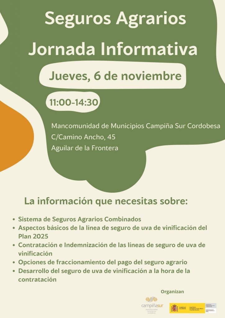 La Mancomunidad de Municipios Campiña Sur Cordobesa, en colaboración con la Entidad Estatal de Seguros Agrarios, O.A. (ENESA), dependiente de la Subsecretaría del Ministerio de Agricultura, Pesca y Alimentación, celebrará el jueves, 6 de noviembre, una Jornada Informativa sobre Seguros Agrarios.